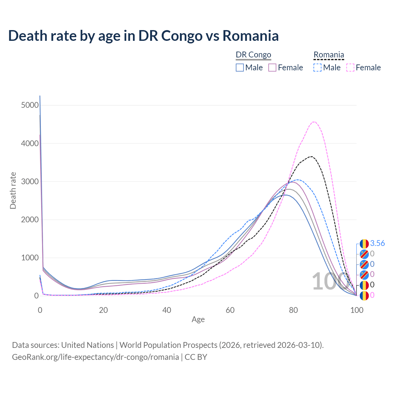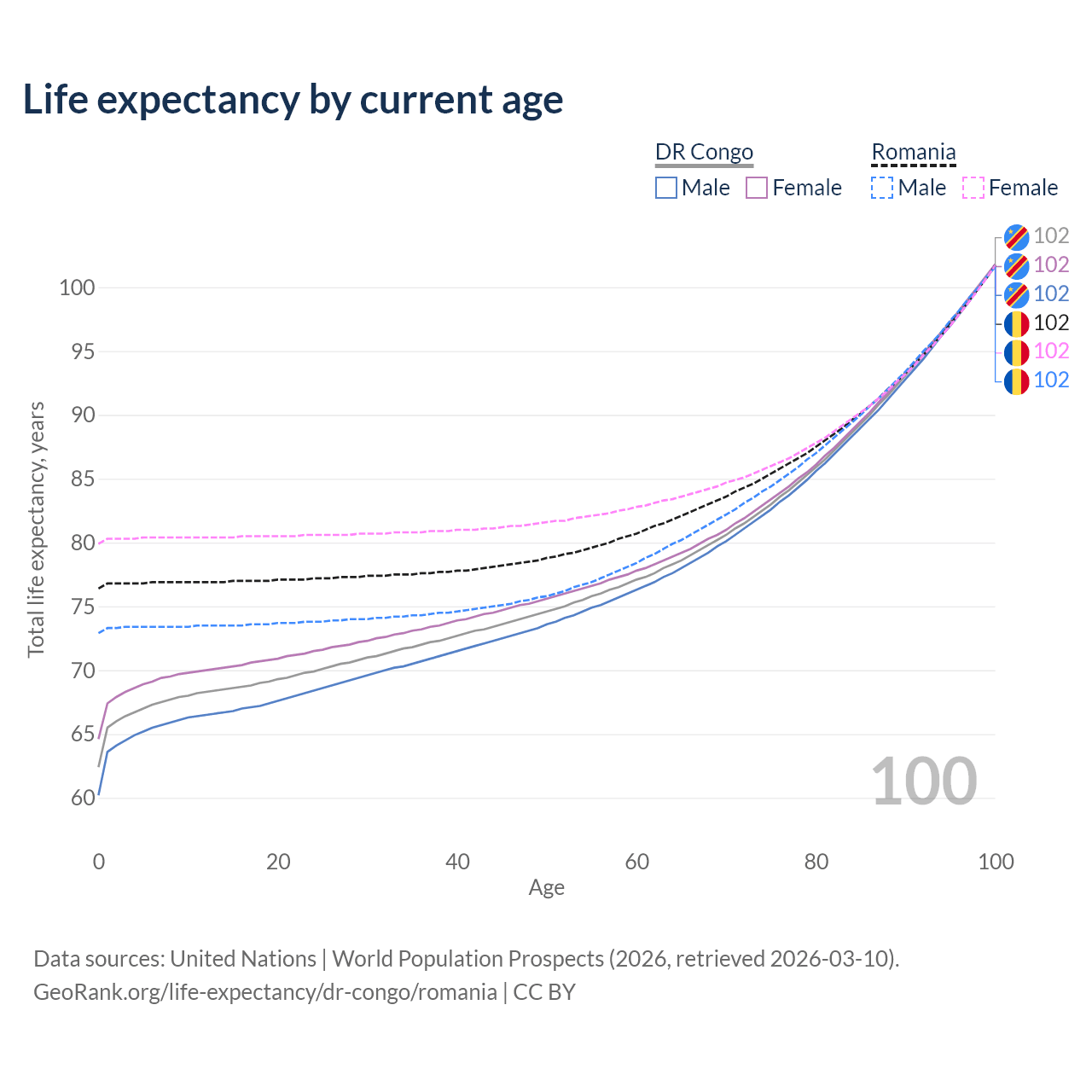 This life expectancy calculator shows the odds of living to 100, 95, 90, and below based on current age for both males and females in the DR Congo and Romania, along with mean and median age of death. The calculations are based on the 2026 life tables (actuarial tables) from the UN World Population Prospects.