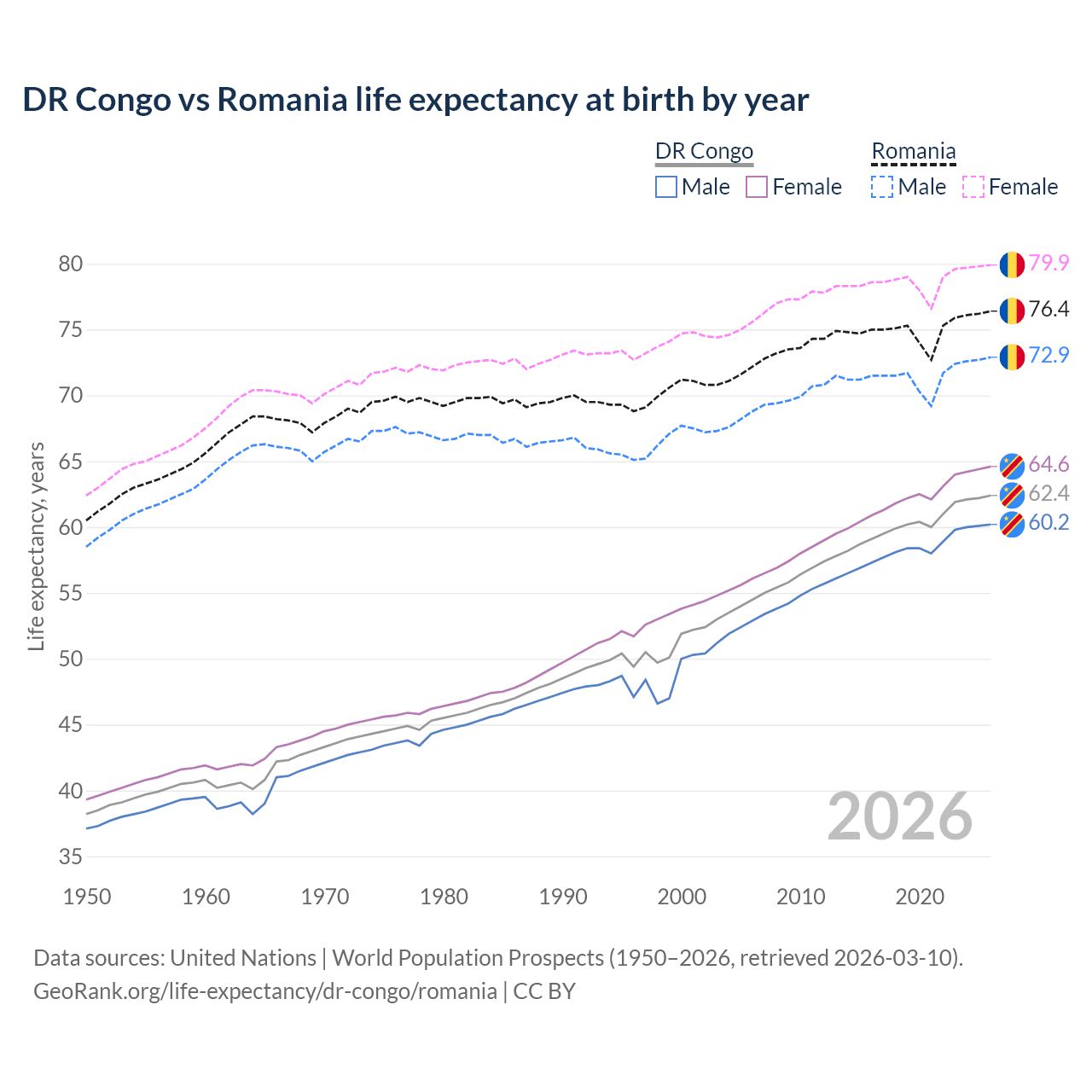 GeoRank.org/life-expectancy/dr-congo/romania | CC BY