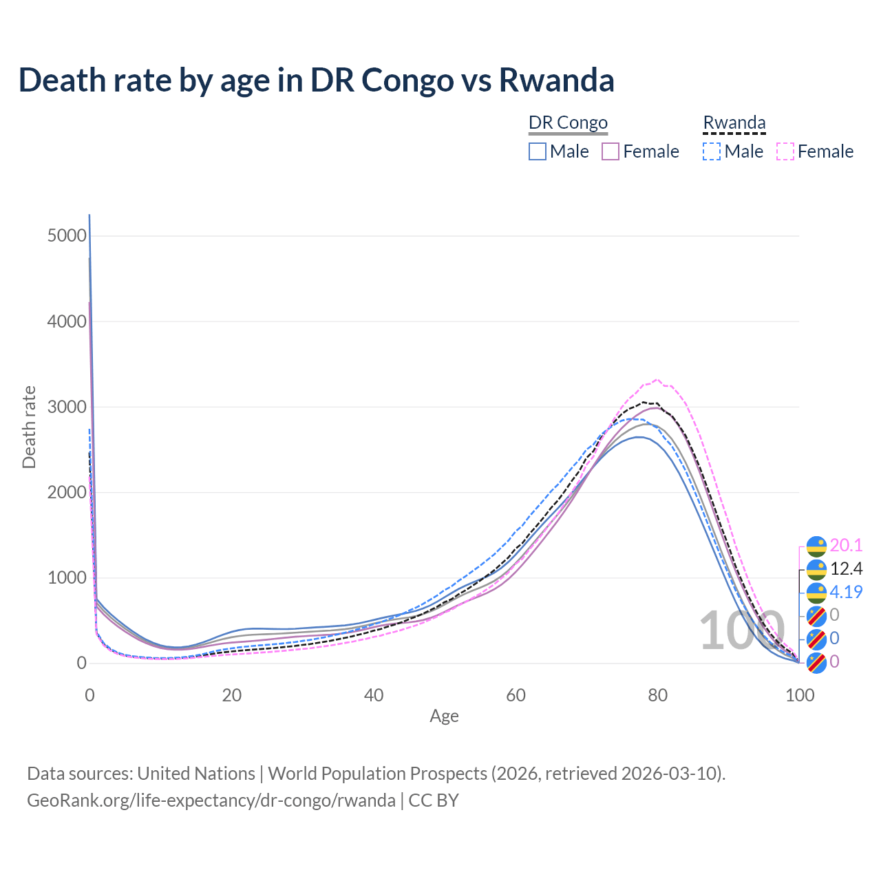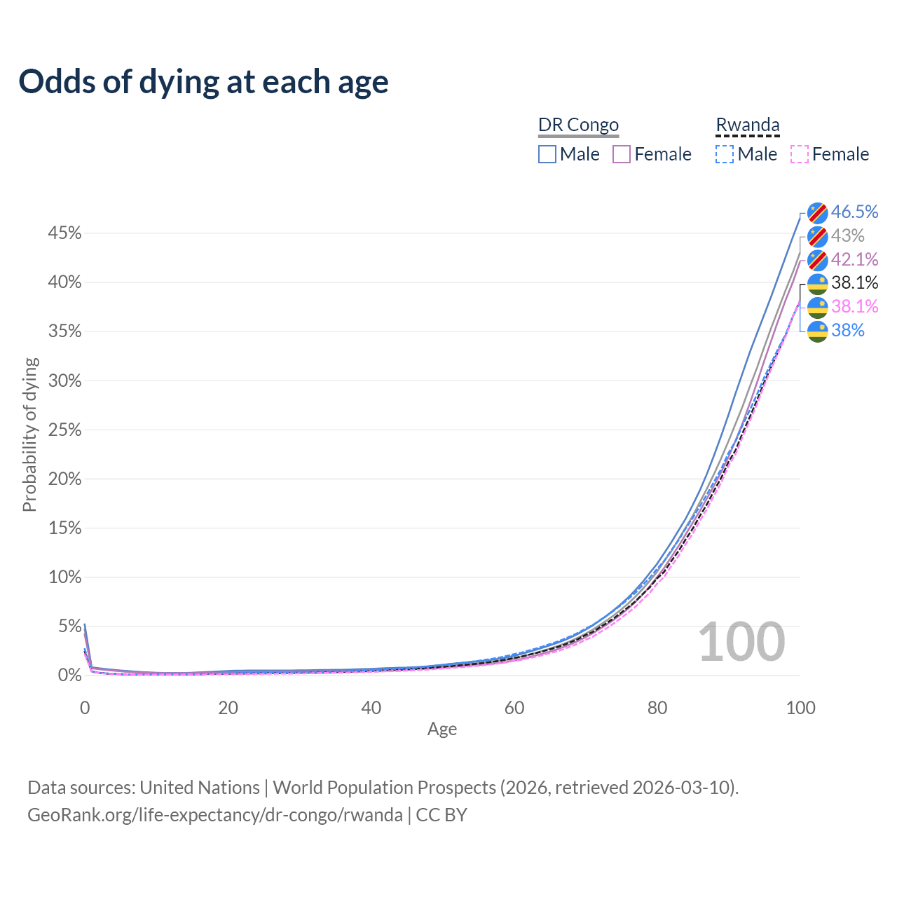 This life expectancy calculator shows the odds of living to 100, 95, 90, and below based on current age for both males and females in the DR Congo and Rwanda, along with mean and median age of death. The calculations are based on the 2026 life tables (actuarial tables) from the UN World Population Prospects.