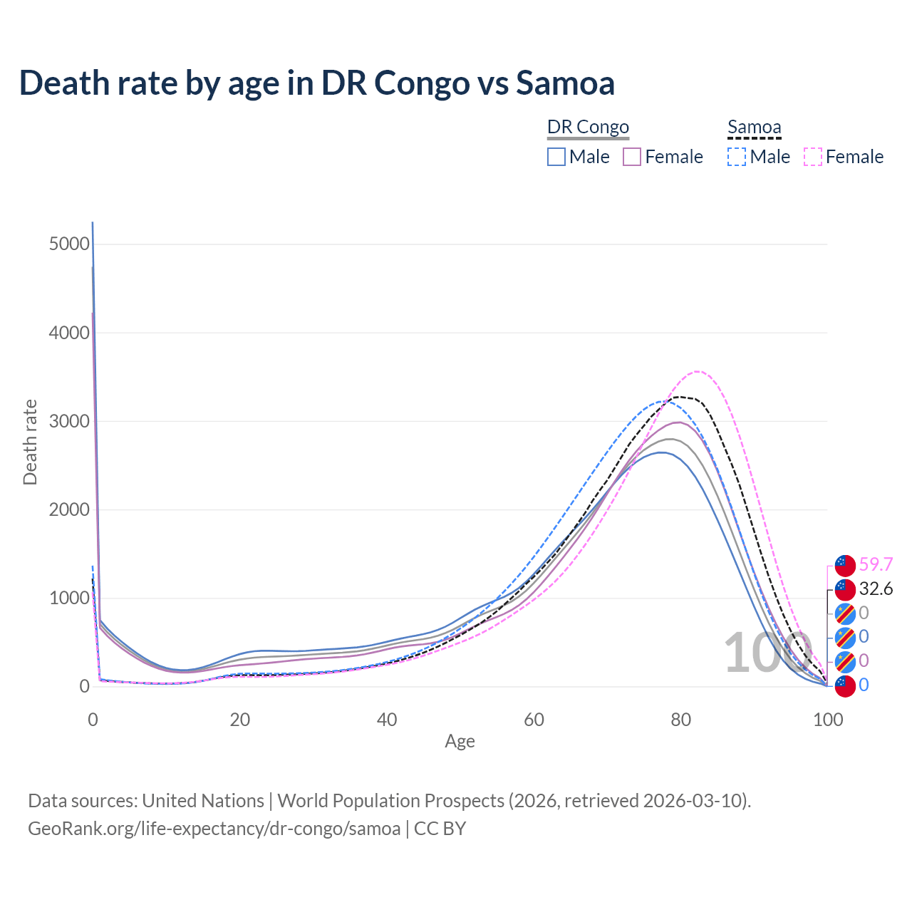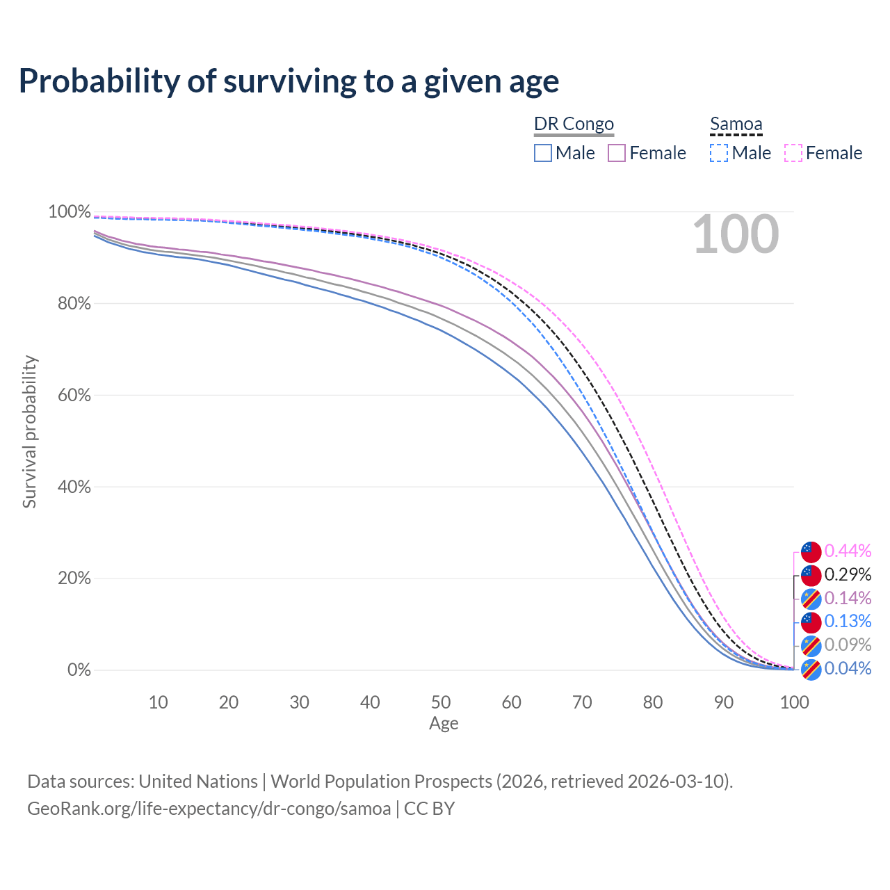 This life expectancy calculator shows the odds of living to 100, 95, 90, and below based on current age for both males and females in the DR Congo and Samoa, along with mean and median age of death. The calculations are based on the 2026 life tables (actuarial tables) from the UN World Population Prospects.