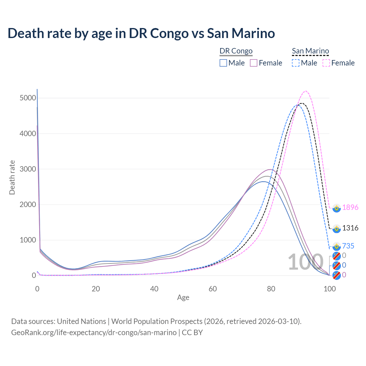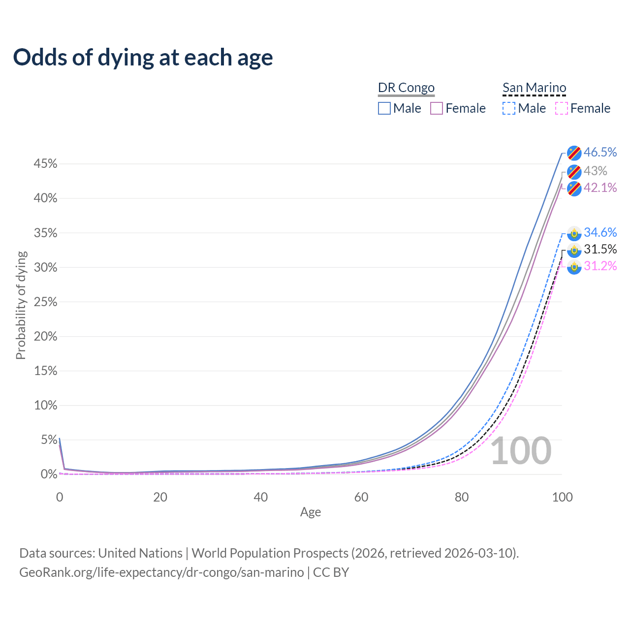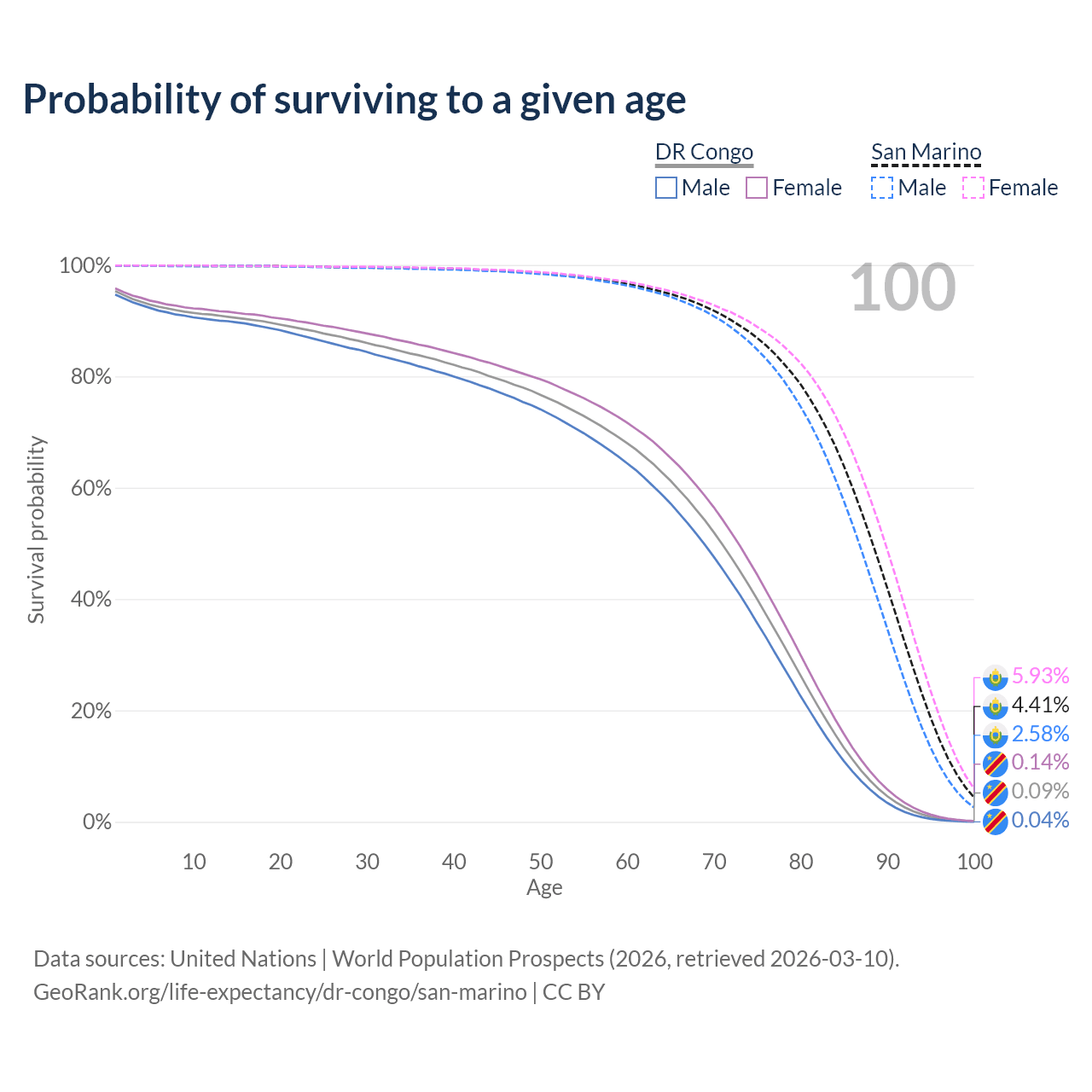 This life expectancy calculator shows the odds of living to 100, 95, 90, and below based on current age for both males and females in the DR Congo and San Marino, along with mean and median age of death. The calculations are based on the 2026 life tables (actuarial tables) from the UN World Population Prospects.