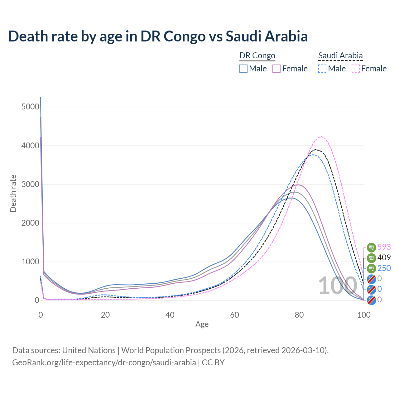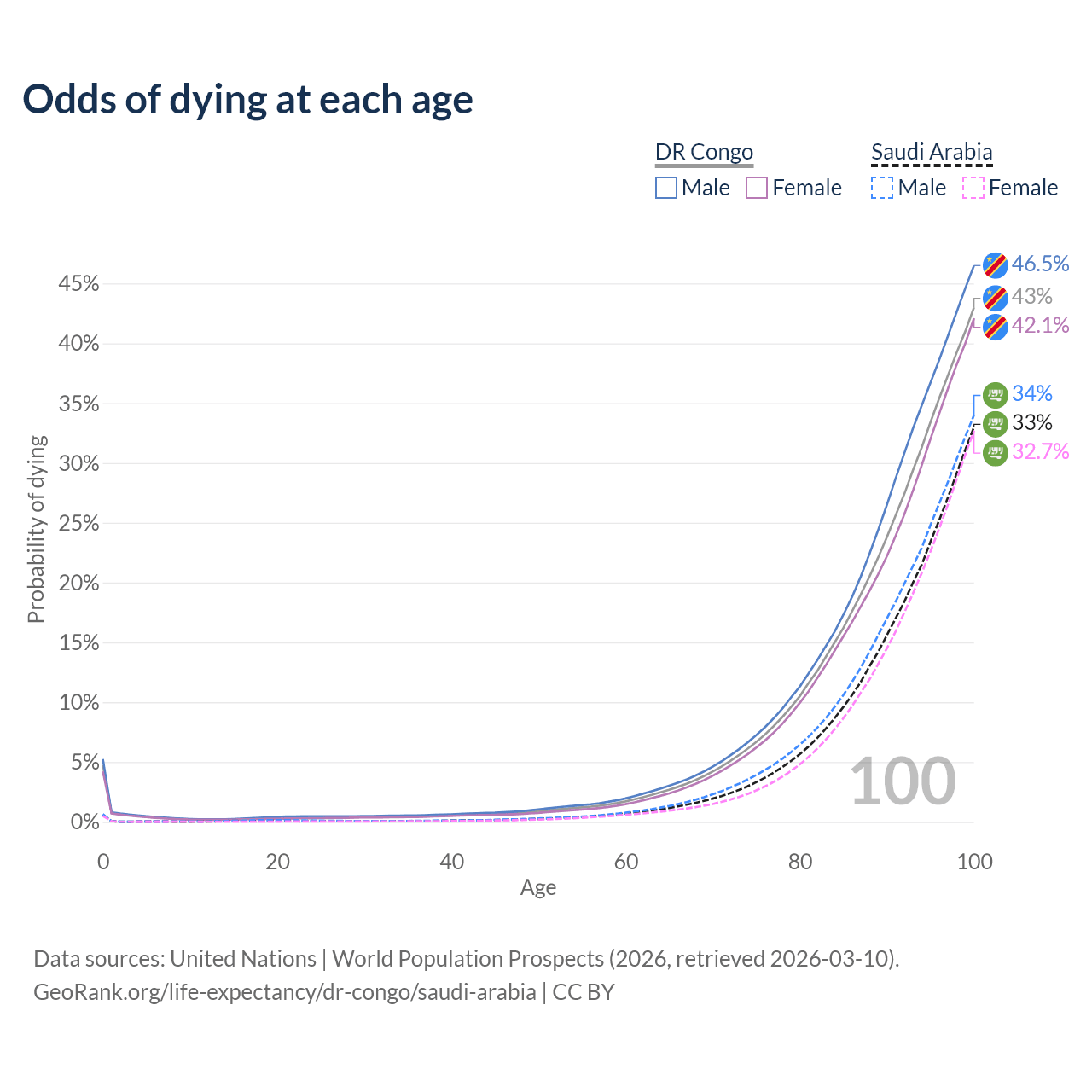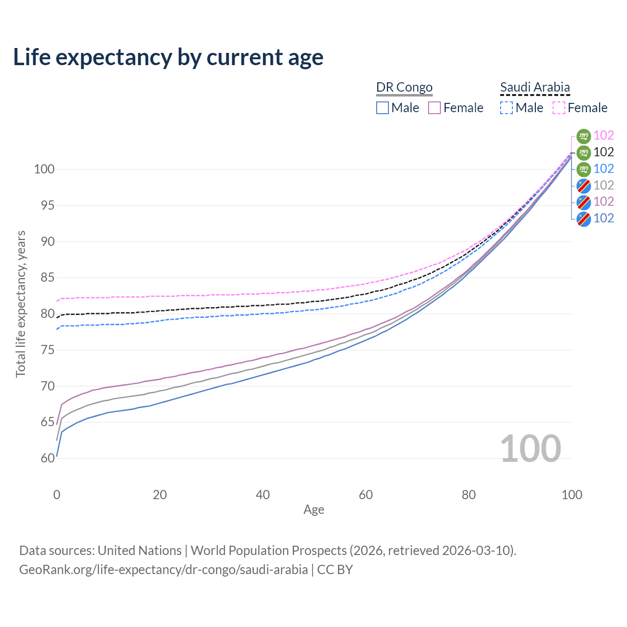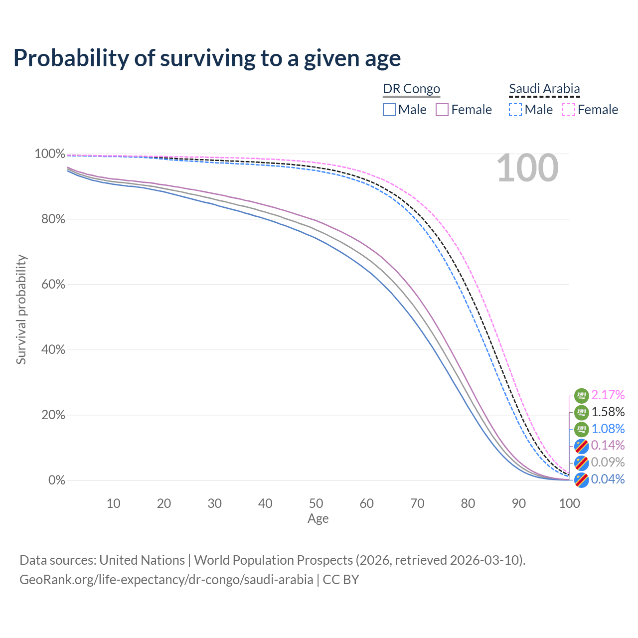 This life expectancy calculator shows the odds of living to 100, 95, 90, and below based on current age for both males and females in the DR Congo and Saudi Arabia, along with mean and median age of death. The calculations are based on the 2026 life tables (actuarial tables) from the UN World Population Prospects.