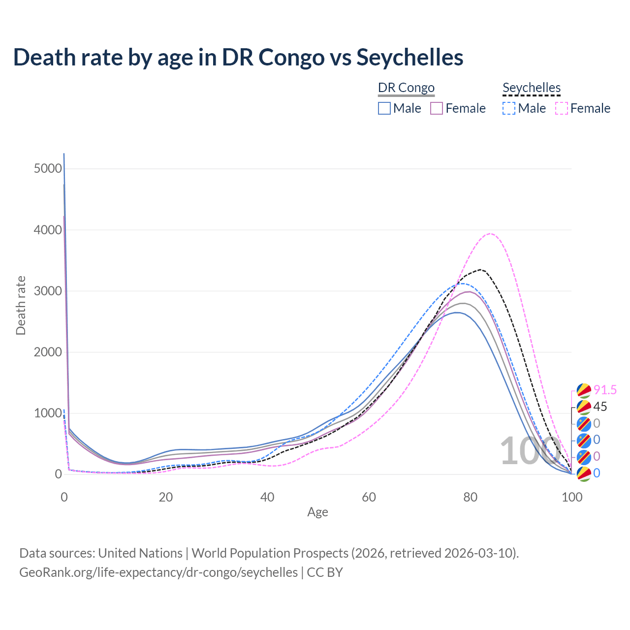 In the DR Congo, the most common age of death is 0, compared to 82 in the Seychelles. The median age of death is 70.9 in the DR Congo and 77 in the Seychelles, meaning only half of each cohort is expected to live past that age.