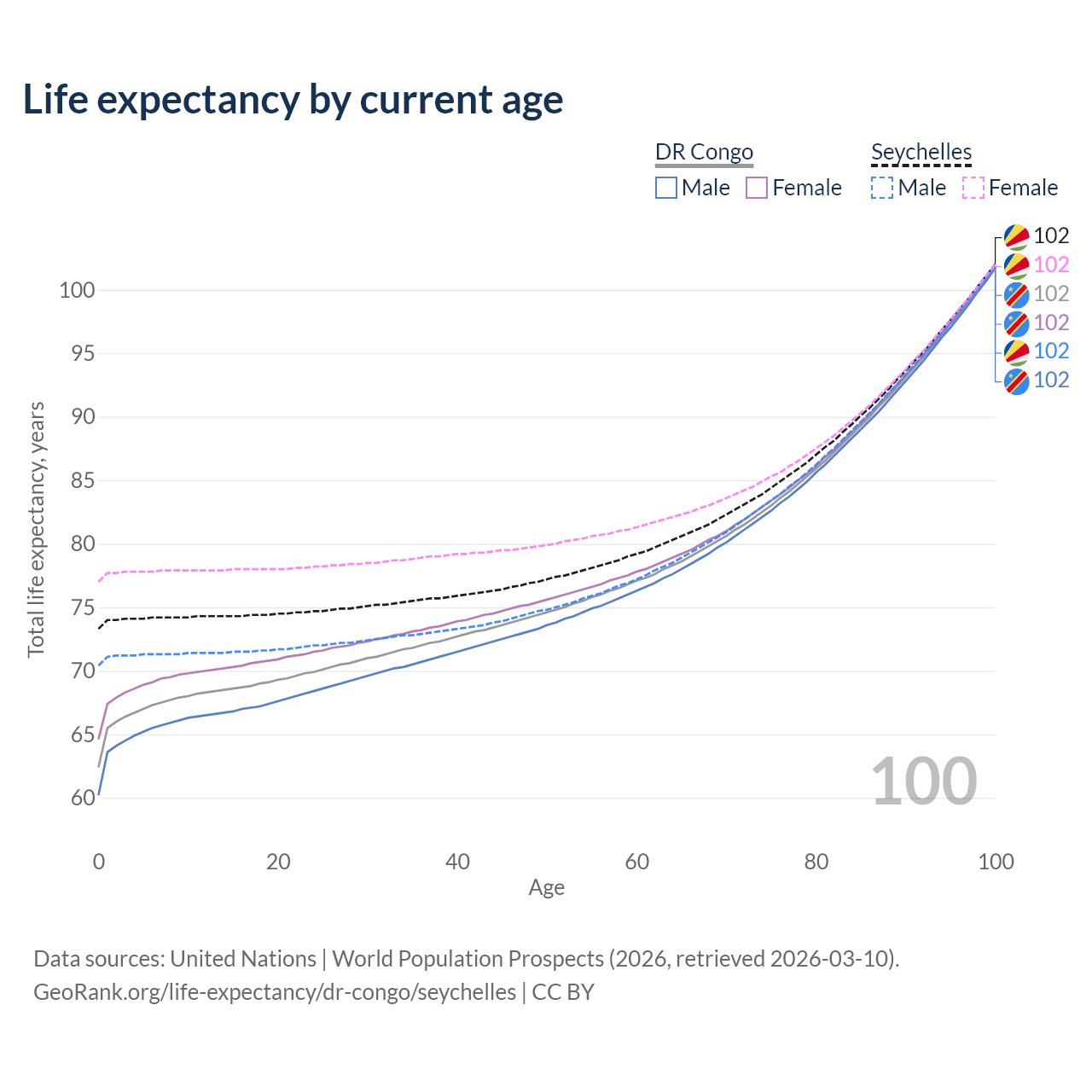 This life expectancy calculator shows the odds of living to 100, 95, 90, and below based on current age for both males and females in the DR Congo and the Seychelles, along with mean and median age of death. The calculations are based on the 2026 life tables (actuarial tables) from the UN World Population Prospects.