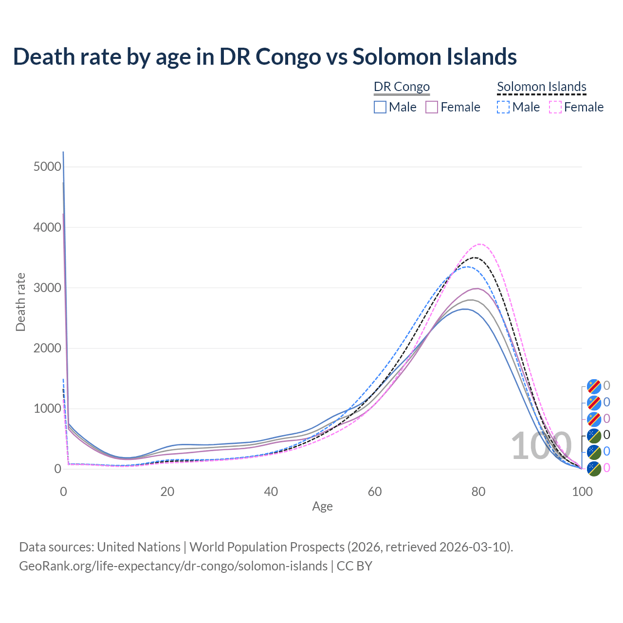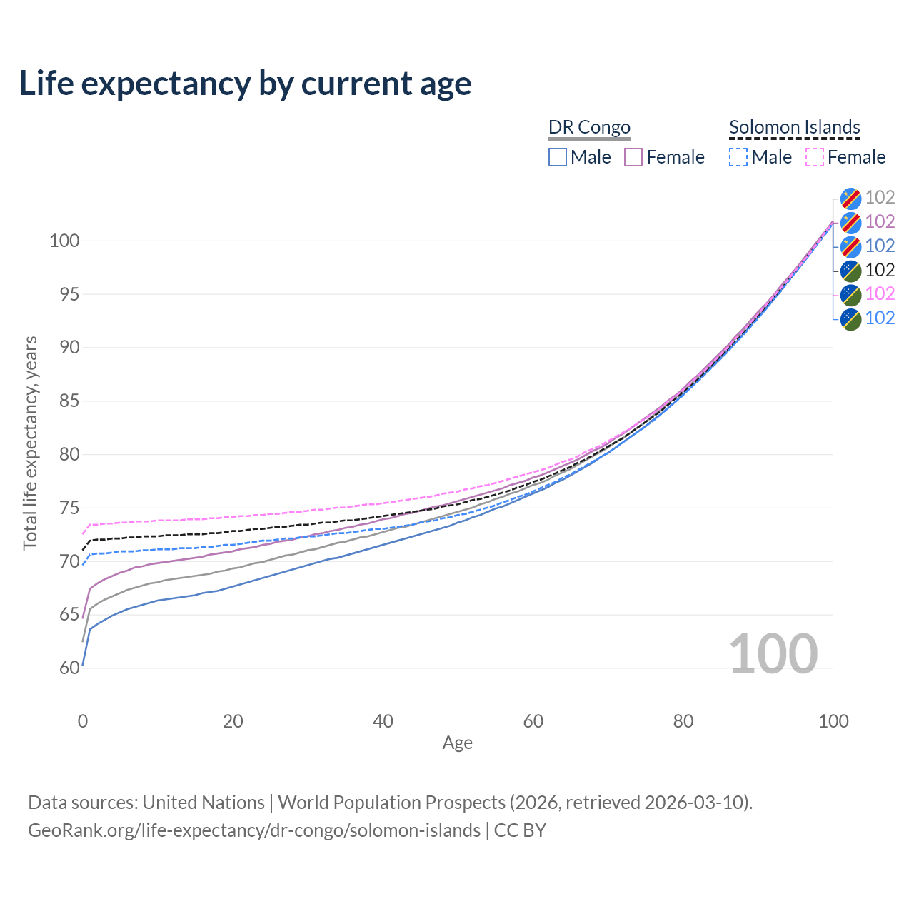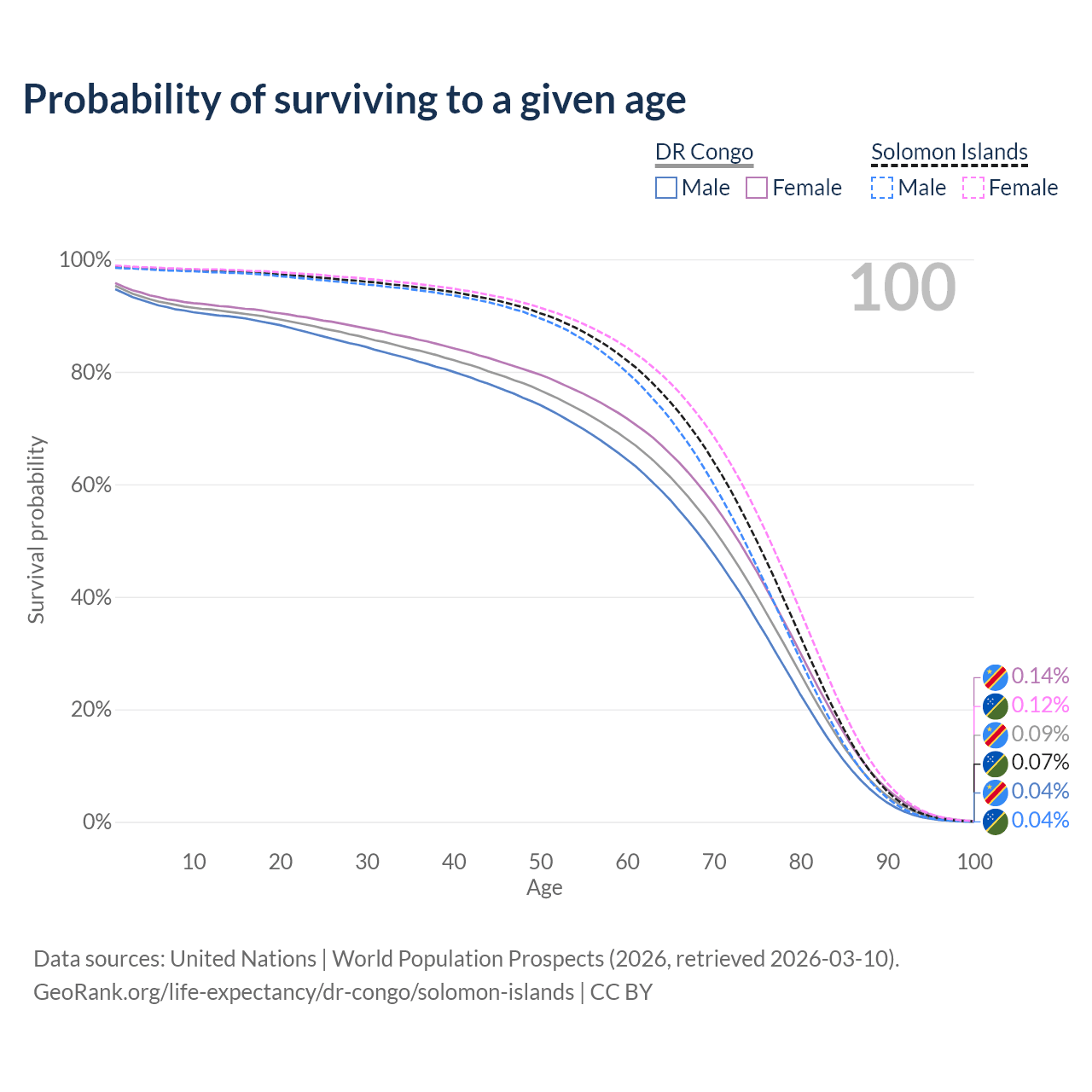 This life expectancy calculator shows the odds of living to 100, 95, 90, and below based on current age for both males and females in the DR Congo and the Solomon Islands, along with mean and median age of death. The calculations are based on the 2026 life tables (actuarial tables) from the UN World Population Prospects.