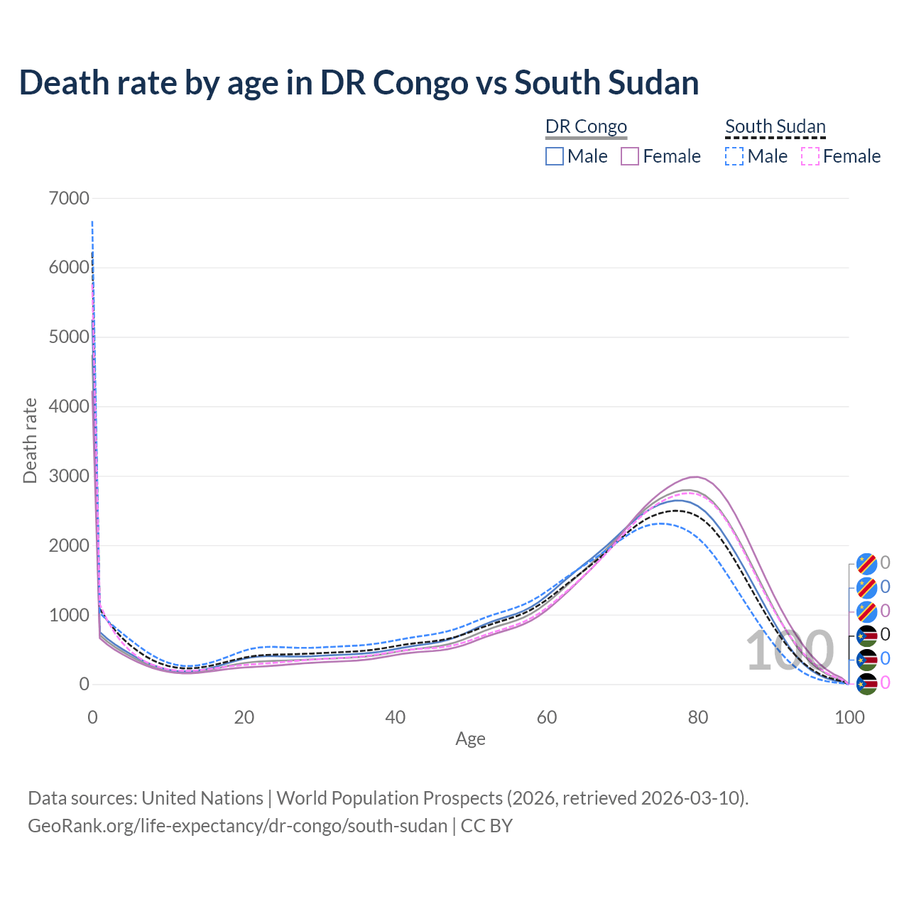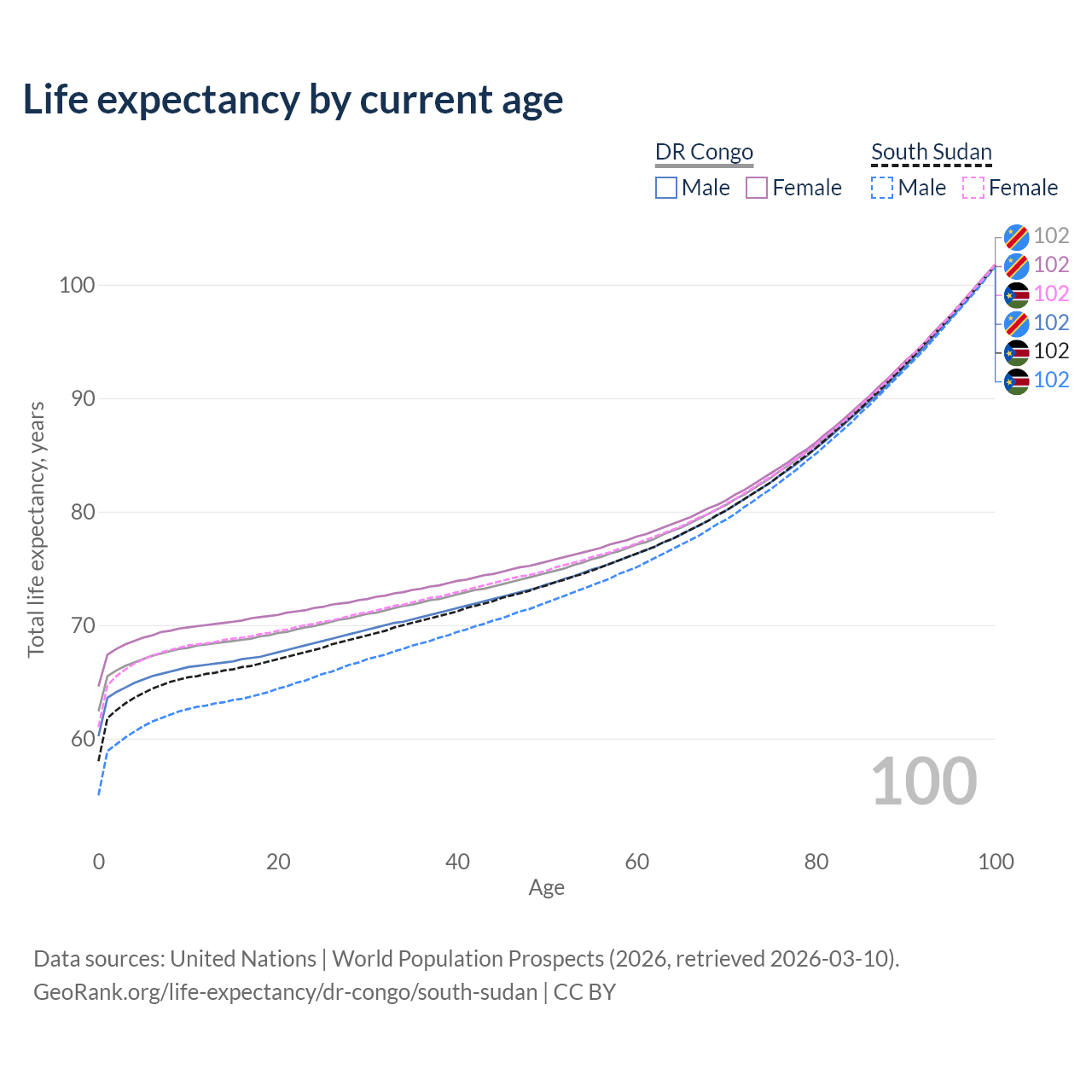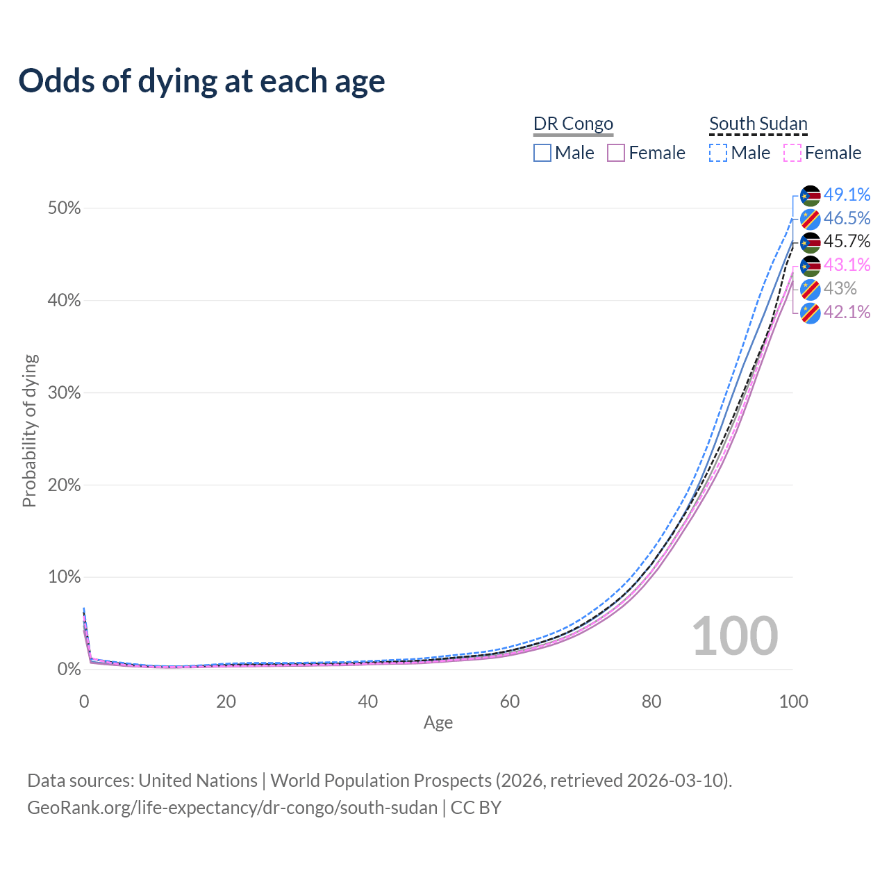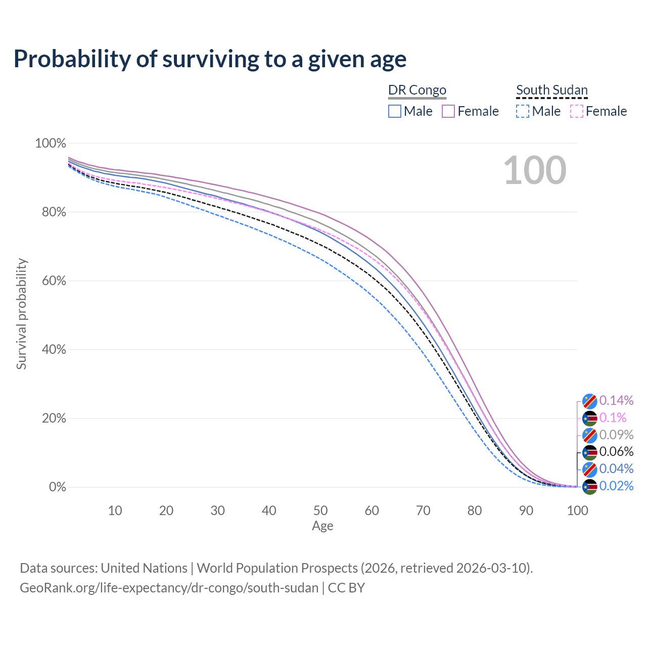 This life expectancy calculator shows the odds of living to 100, 95, 90, and below based on current age for both males and females in the DR Congo and South Sudan, along with mean and median age of death. The calculations are based on the 2026 life tables (actuarial tables) from the UN World Population Prospects.
