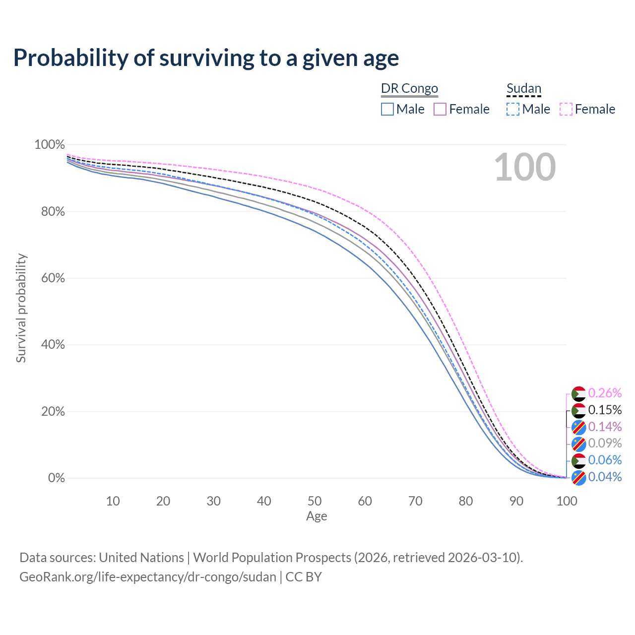 This life expectancy calculator shows the odds of living to 100, 95, 90, and below based on current age for both males and females in the DR Congo and Sudan, along with mean and median age of death. The calculations are based on the 2026 life tables (actuarial tables) from the UN World Population Prospects.
