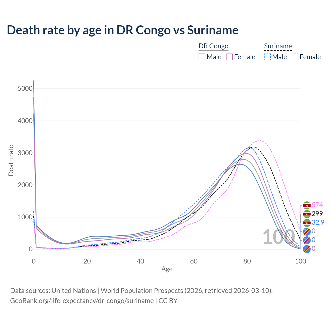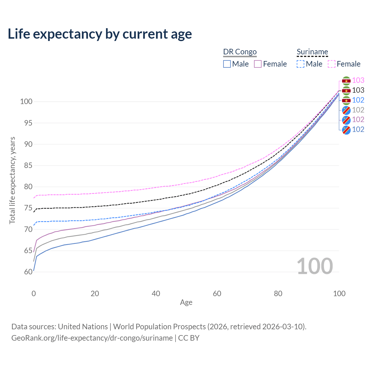 This life expectancy calculator shows the odds of living to 100, 95, 90, and below based on current age for both males and females in the DR Congo and Suriname, along with mean and median age of death. The calculations are based on the 2026 life tables (actuarial tables) from the UN World Population Prospects.