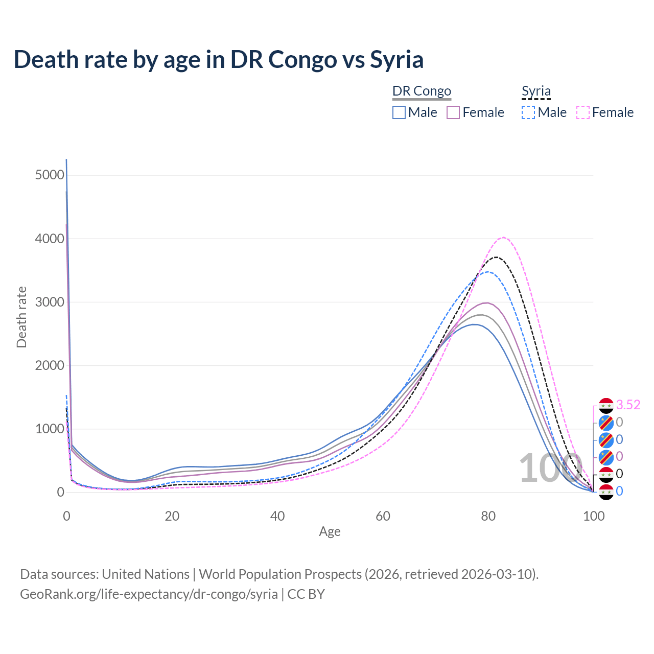 In the DR Congo, the most common age of death is 0, compared to 82 in Syria. The median age of death is 70.9 in the DR Congo and 77.7 in Syria, meaning only half of each cohort is expected to live past that age.