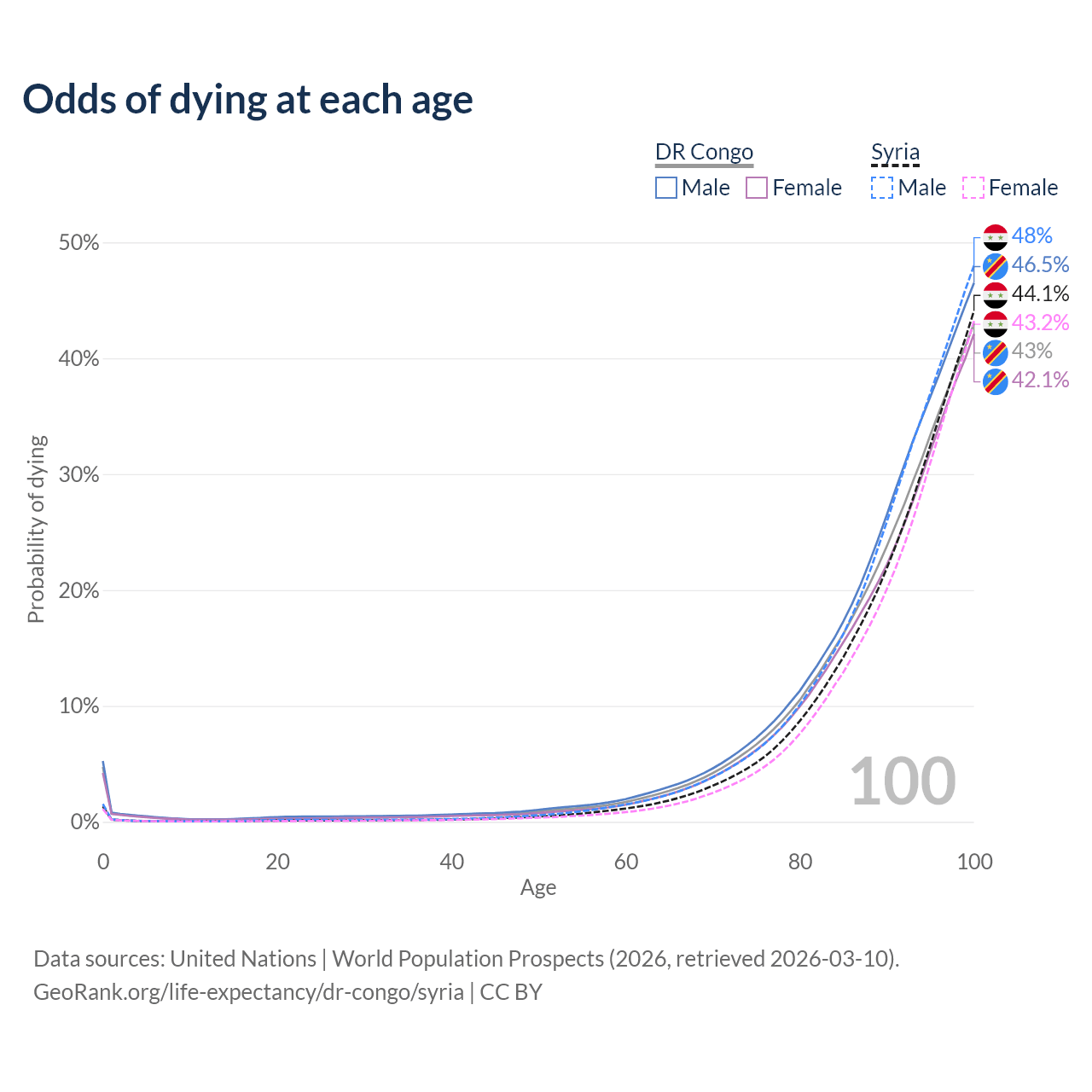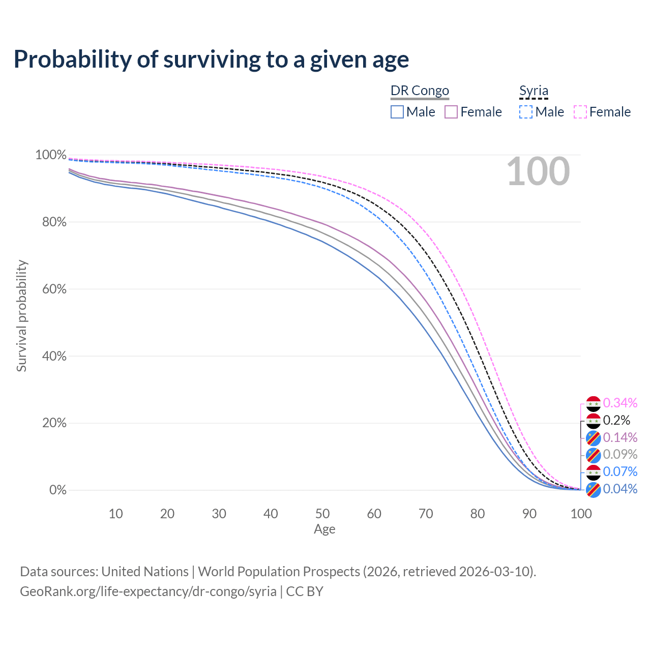 This life expectancy calculator shows the odds of living to 100, 95, 90, and below based on current age for both males and females in the DR Congo and Syria, along with mean and median age of death. The calculations are based on the 2026 life tables (actuarial tables) from the UN World Population Prospects.