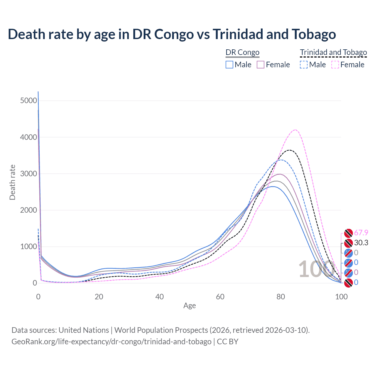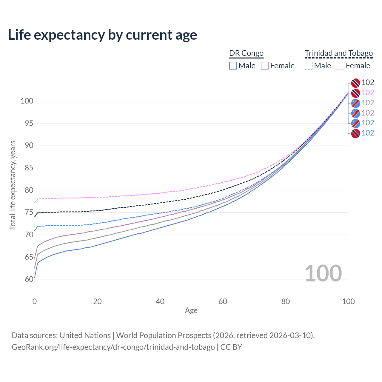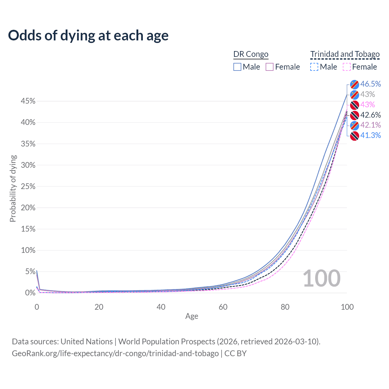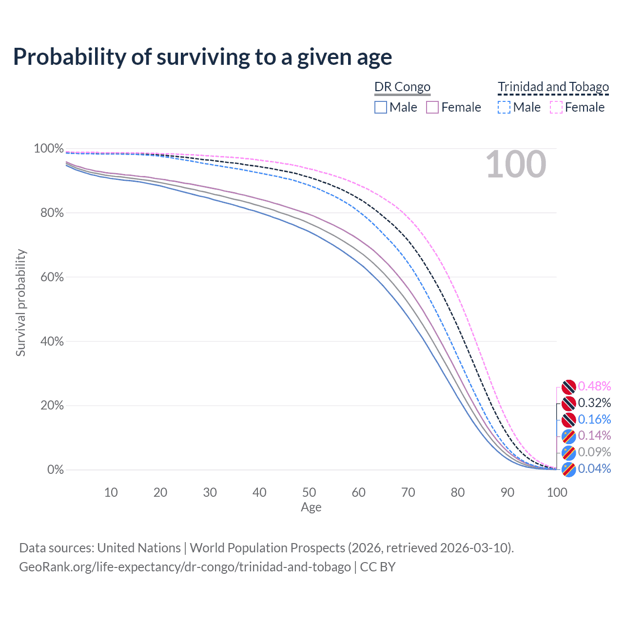 This life expectancy calculator shows the odds of living to 100, 95, 90, and below based on current age for both males and females in the DR Congo and Trinidad and Tobago, along with mean and median age of death. The calculations are based on the 2026 life tables (actuarial tables) from the UN World Population Prospects.