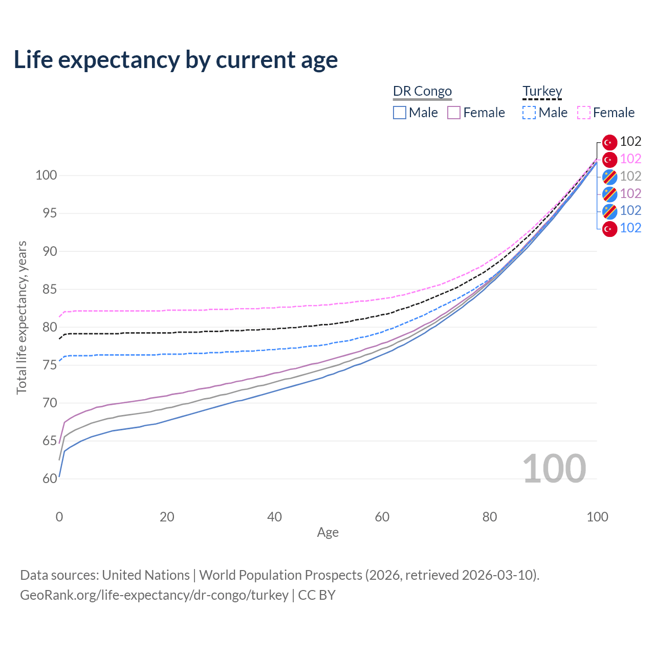 This life expectancy calculator shows the odds of living to 100, 95, 90, and below based on current age for both males and females in the DR Congo and Turkey, along with mean and median age of death. The calculations are based on the 2026 life tables (actuarial tables) from the UN World Population Prospects.