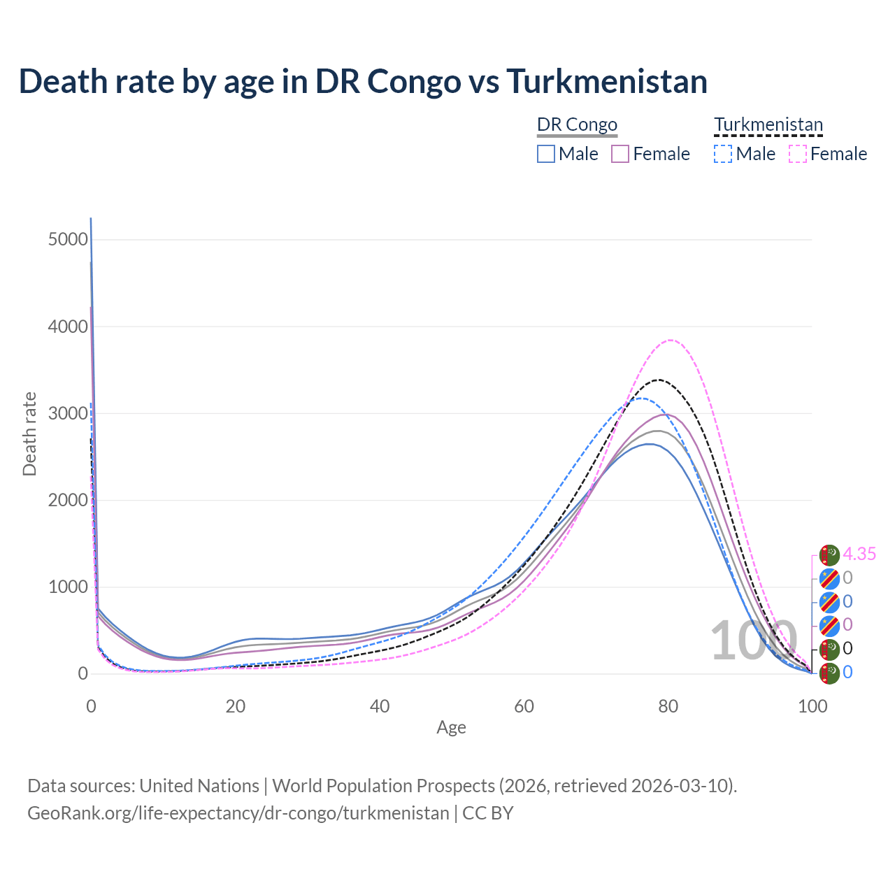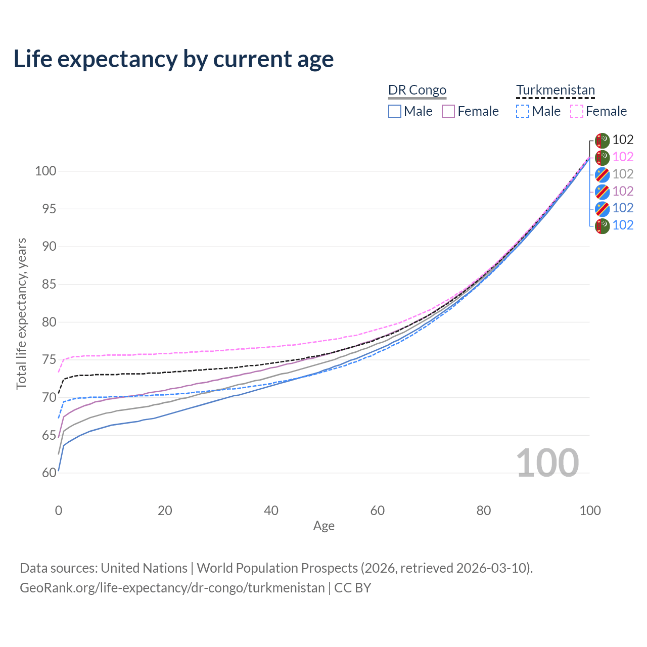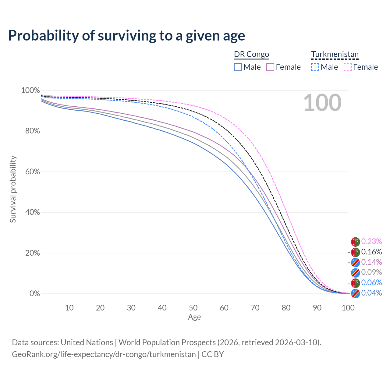 This life expectancy calculator shows the odds of living to 100, 95, 90, and below based on current age for both males and females in the DR Congo and Turkmenistan, along with mean and median age of death. The calculations are based on the 2026 life tables (actuarial tables) from the UN World Population Prospects.