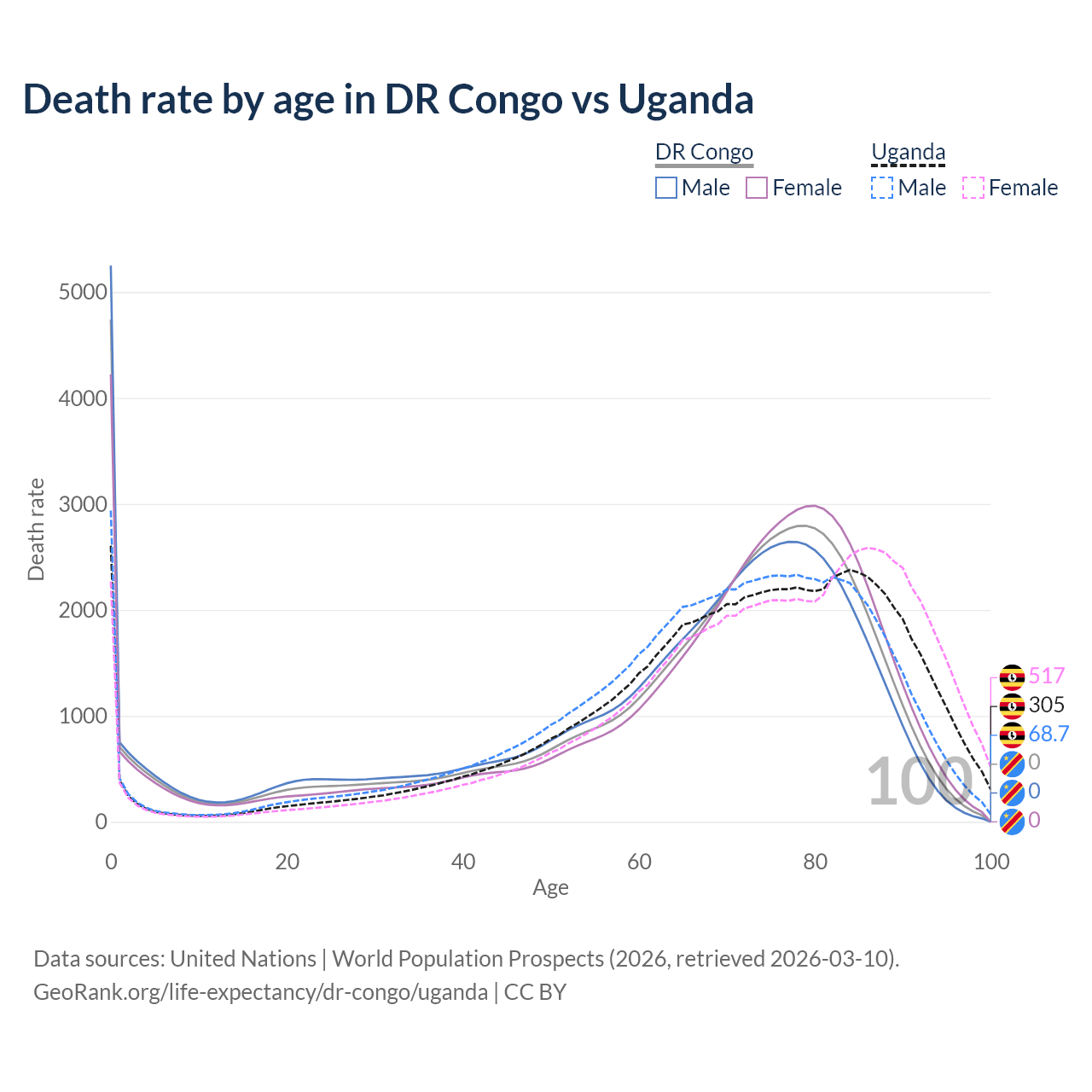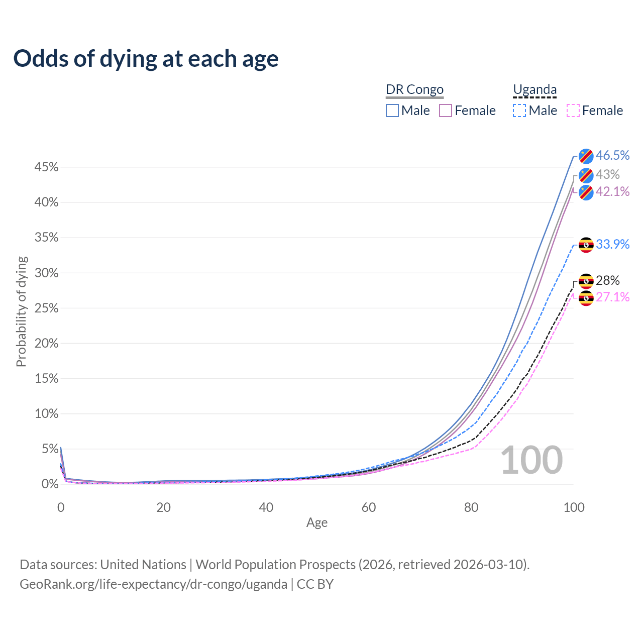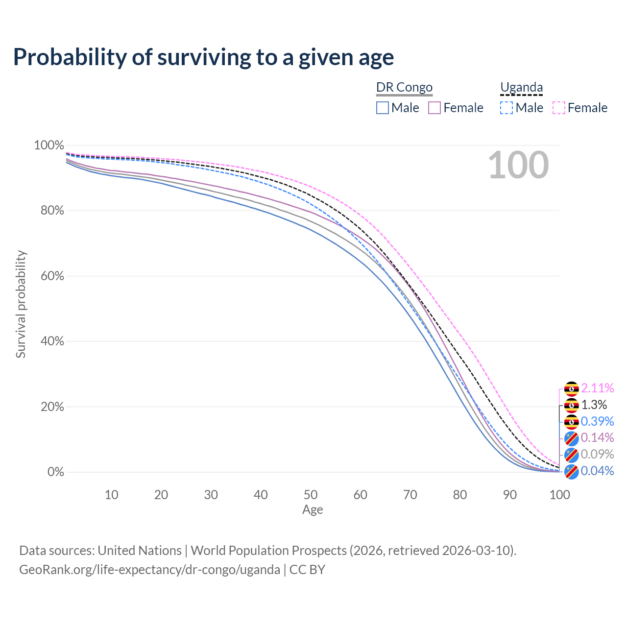 This life expectancy calculator shows the odds of living to 100, 95, 90, and below based on current age for both males and females in the DR Congo and Uganda, along with mean and median age of death. The calculations are based on the 2026 life tables (actuarial tables) from the UN World Population Prospects.