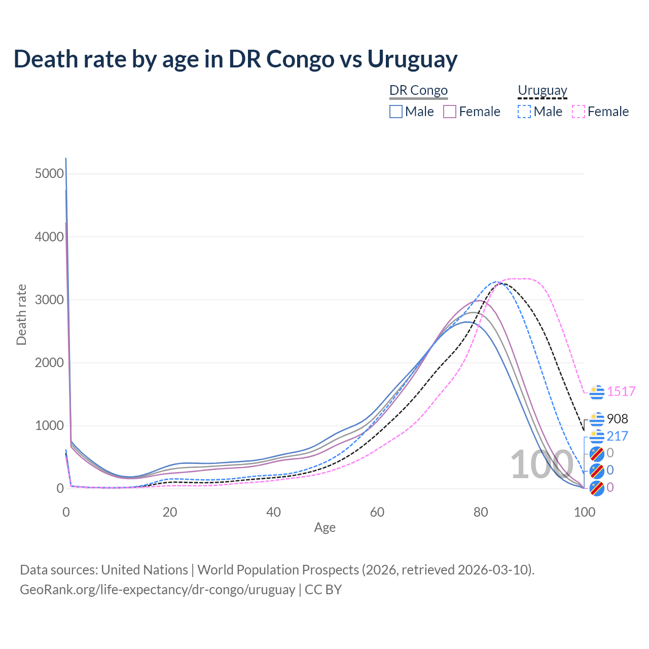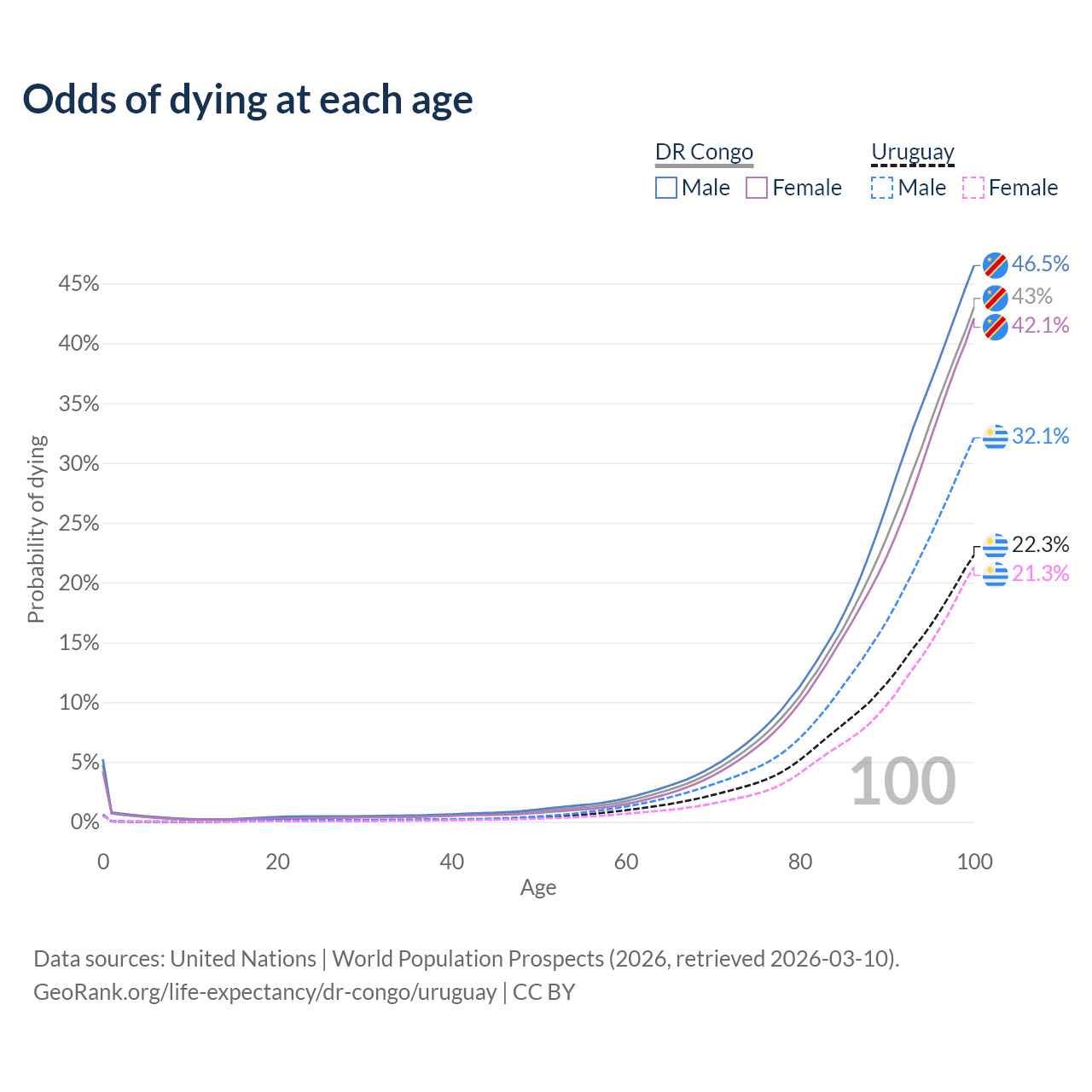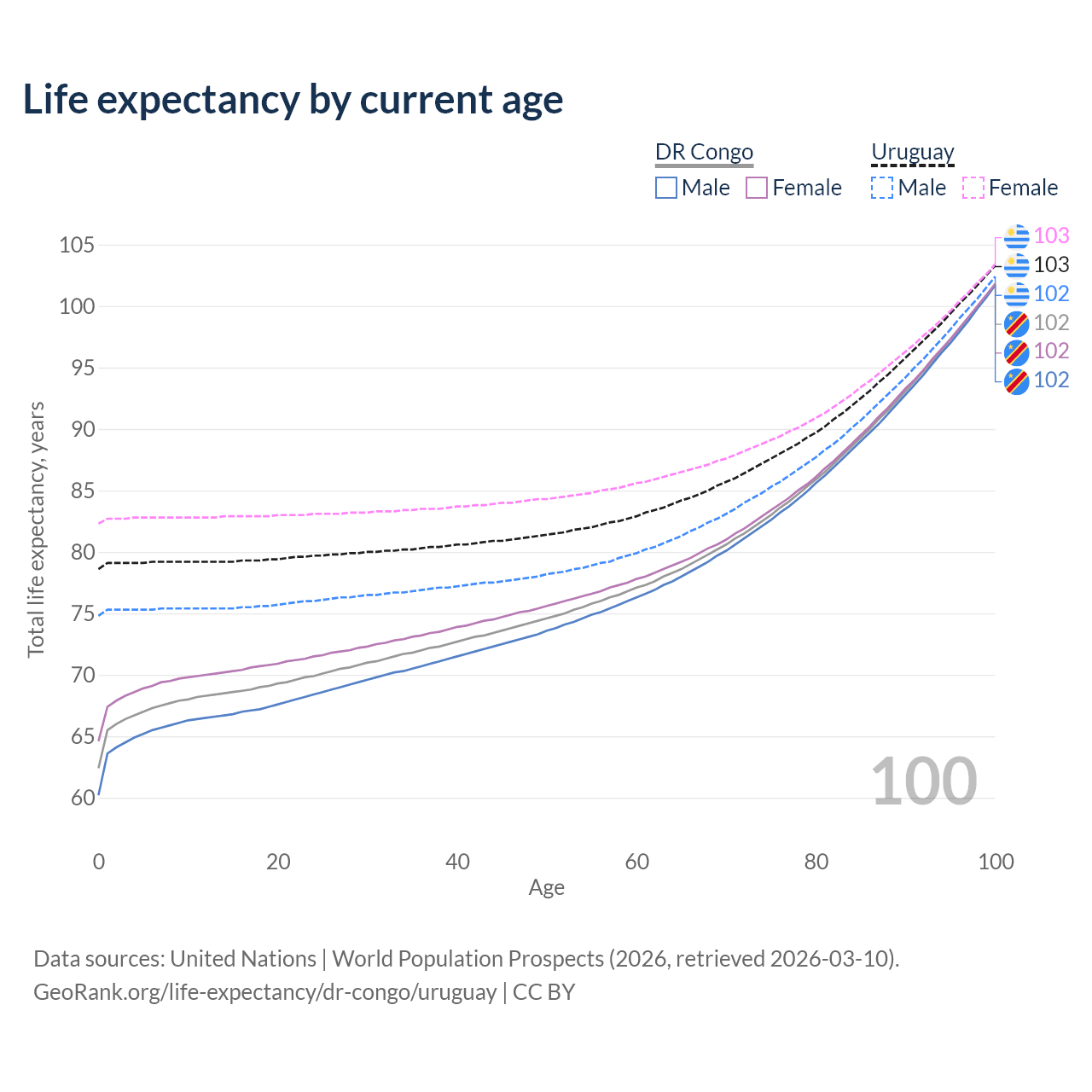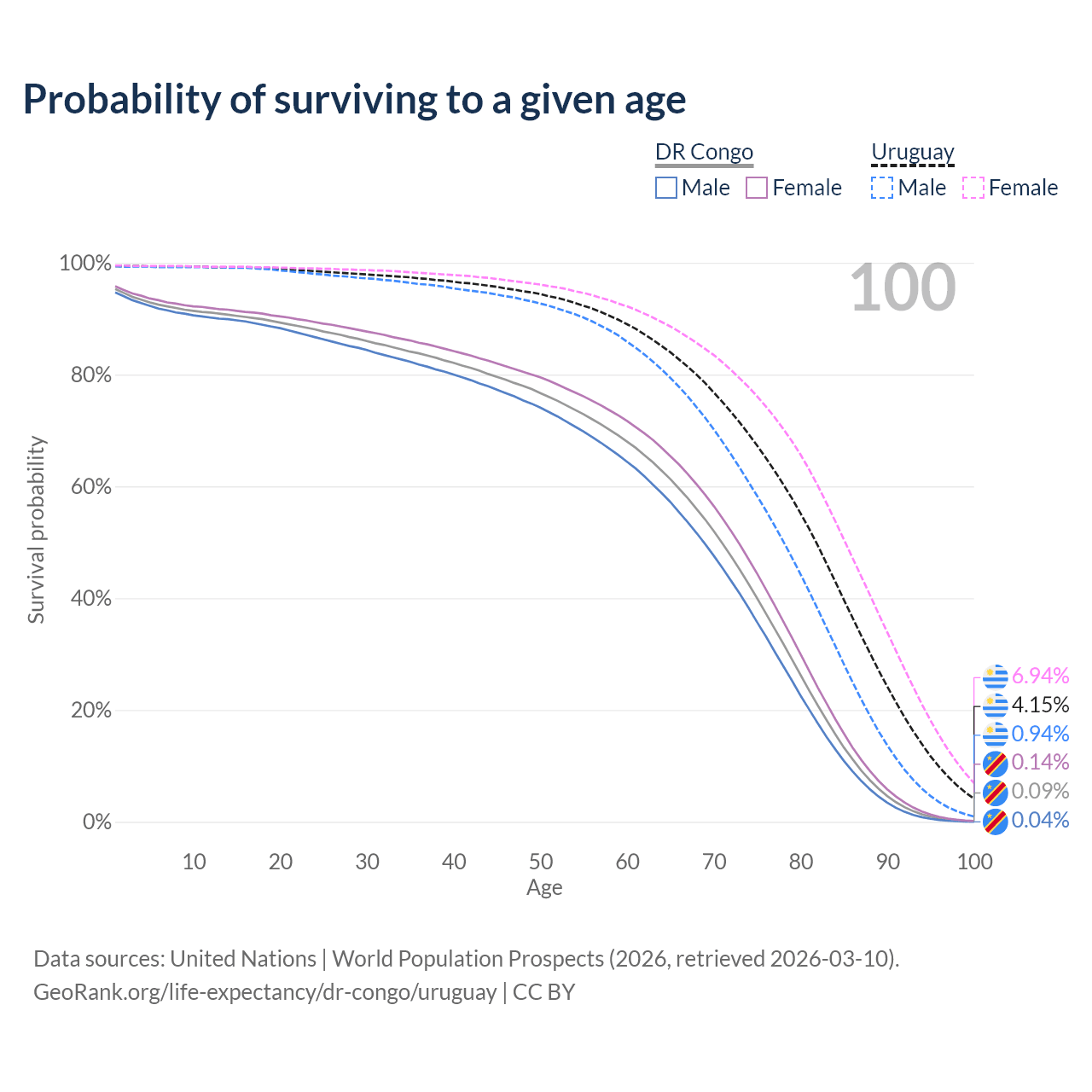 This life expectancy calculator shows the odds of living to 100, 95, 90, and below based on current age for both males and females in the DR Congo and Uruguay, along with mean and median age of death. The calculations are based on the 2026 life tables (actuarial tables) from the UN World Population Prospects.
