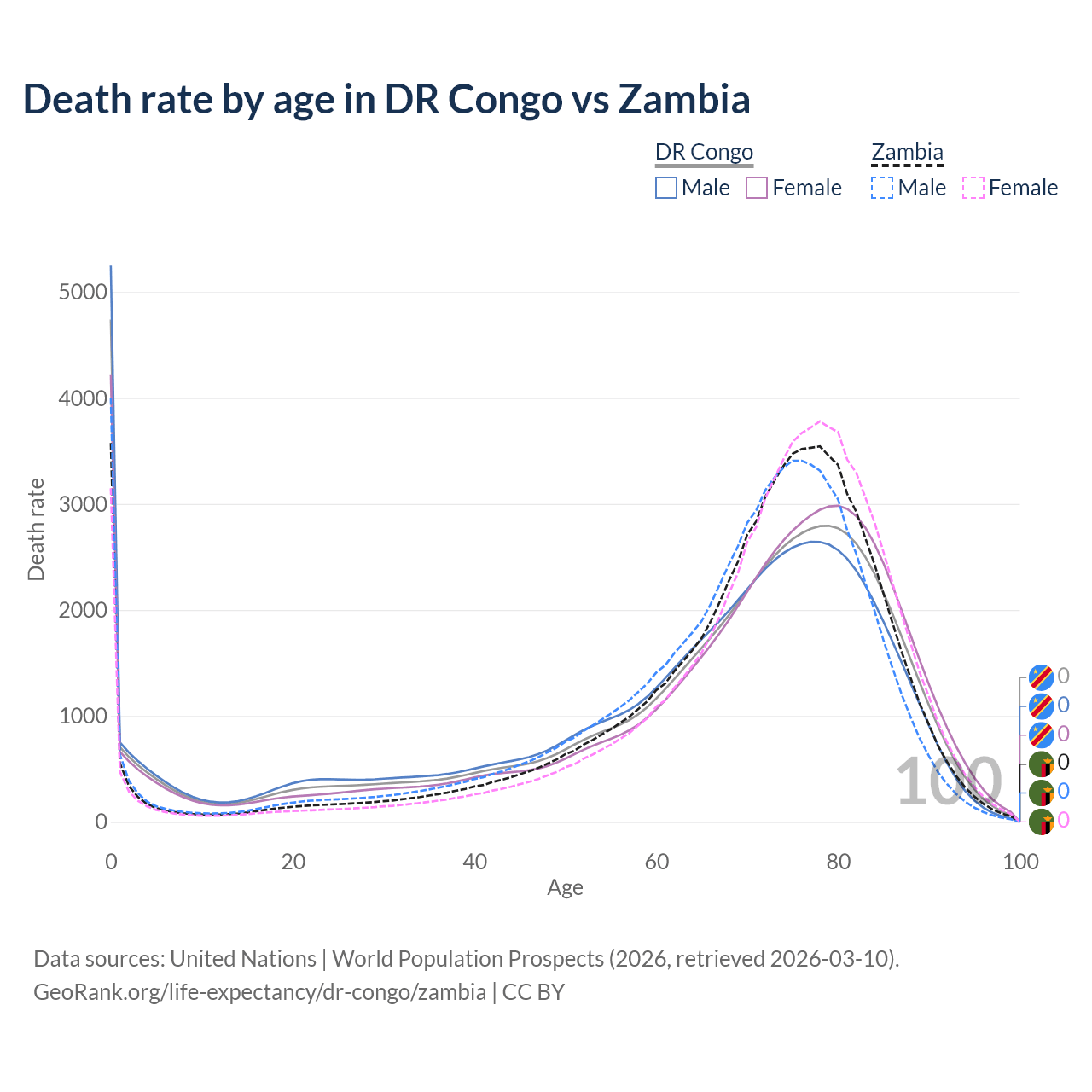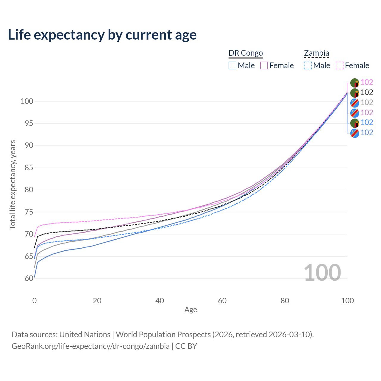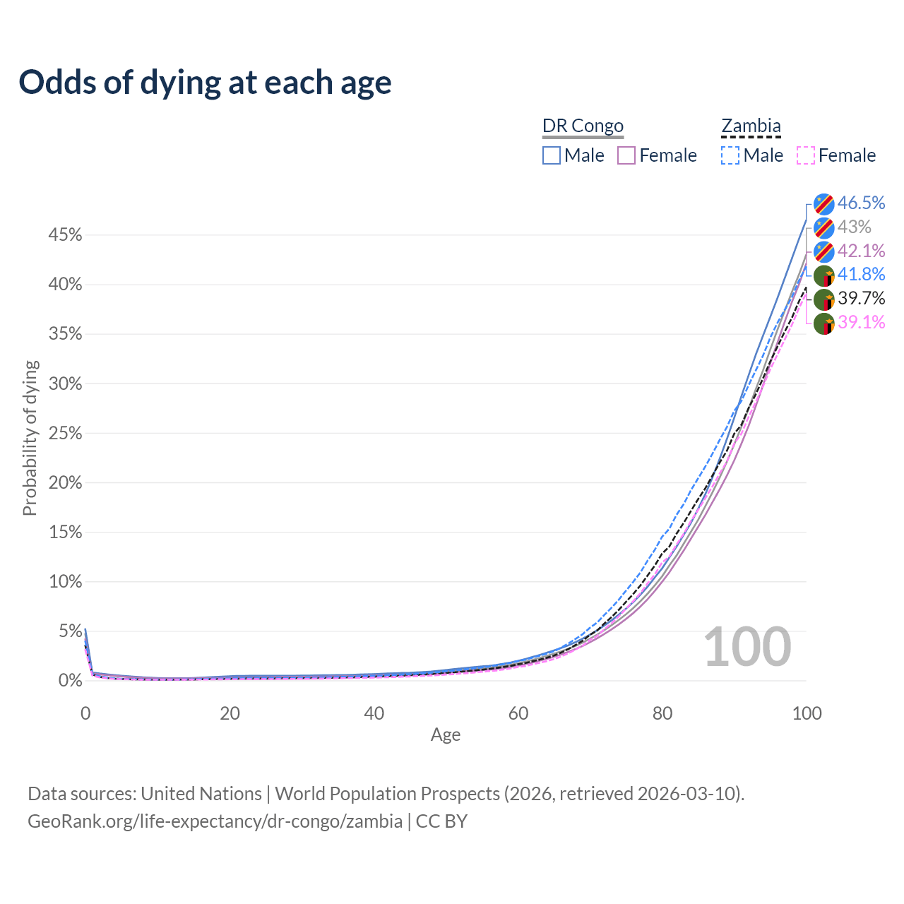 This life expectancy calculator shows the odds of living to 100, 95, 90, and below based on current age for both males and females in the DR Congo and Zambia, along with mean and median age of death. The calculations are based on the 2026 life tables (actuarial tables) from the UN World Population Prospects.