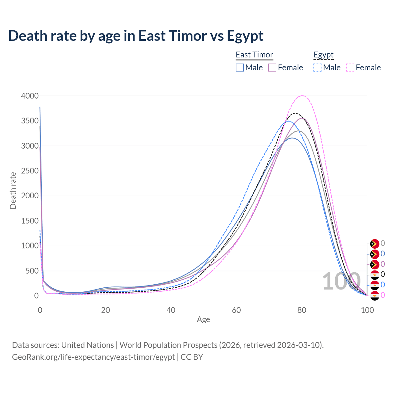 In East Timor, the most common age of death is 0, compared to 78 in Egypt. The median age of death is 73.9 in East Timor and 75.2 in Egypt, meaning only half of each cohort is expected to live past that age.