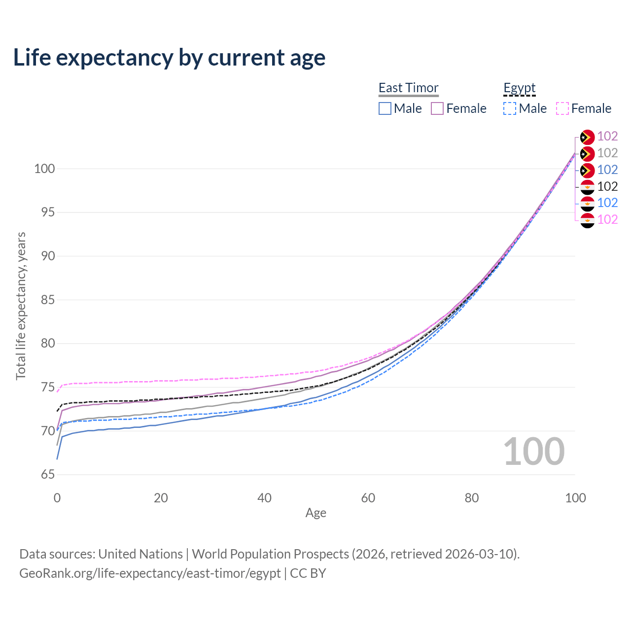 The average life expectancy at birth is 68.3 years in East Timor vs 72.2 in Egypt. East Timor is ranked 149/197 by life expectancy, and Egypt is 122/197. In East Timor, the life expectancy is 66.7 years for males and 70.1 years for females. In Egypt, it's 70 years for males and 74.4 years for females.