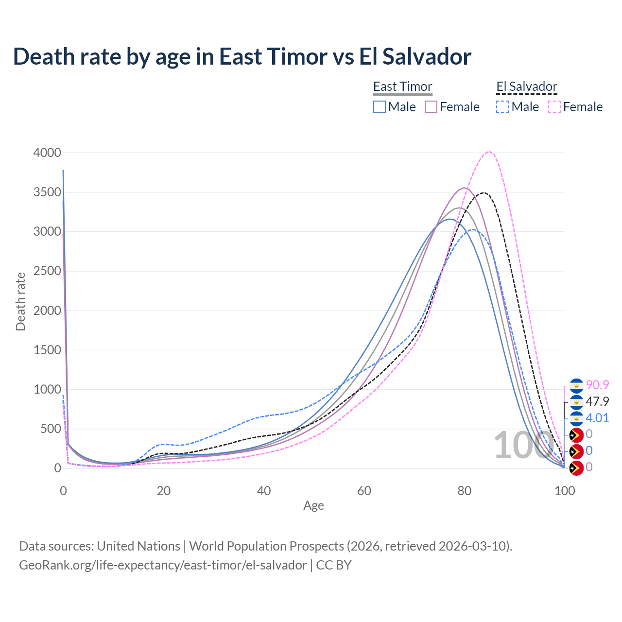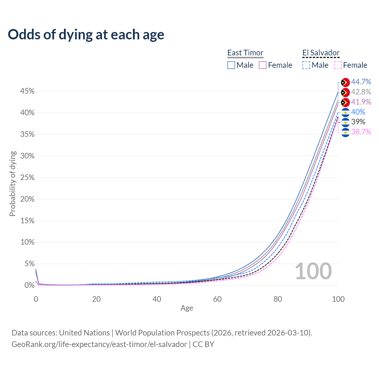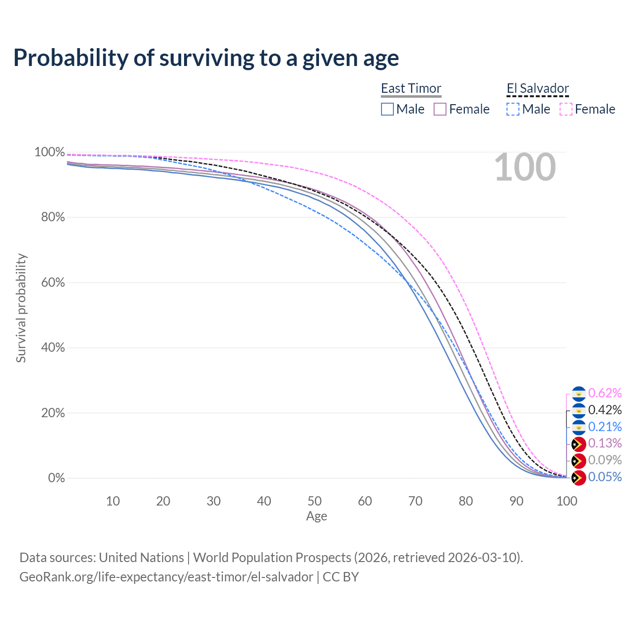 This life expectancy calculator shows the odds of living to 100, 95, 90, and below based on current age for both males and females in East Timor and El Salvador, along with mean and median age of death. The calculations are based on the 2026 life tables (actuarial tables) from the UN World Population Prospects.