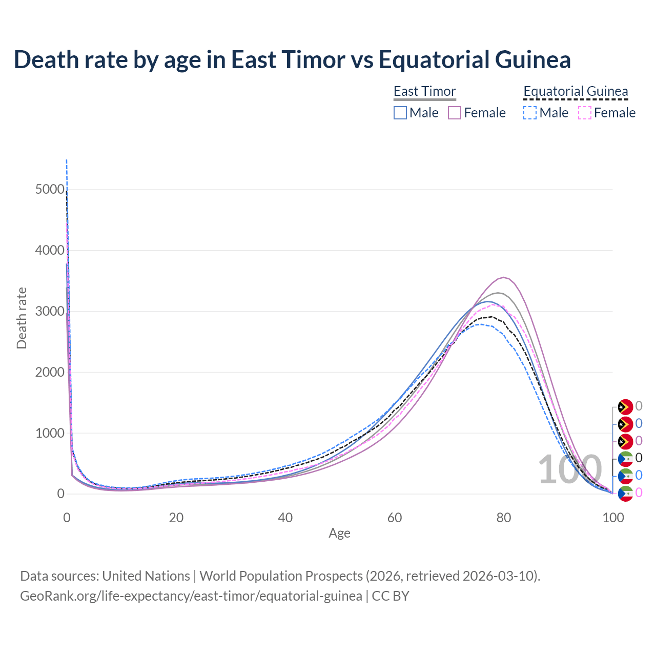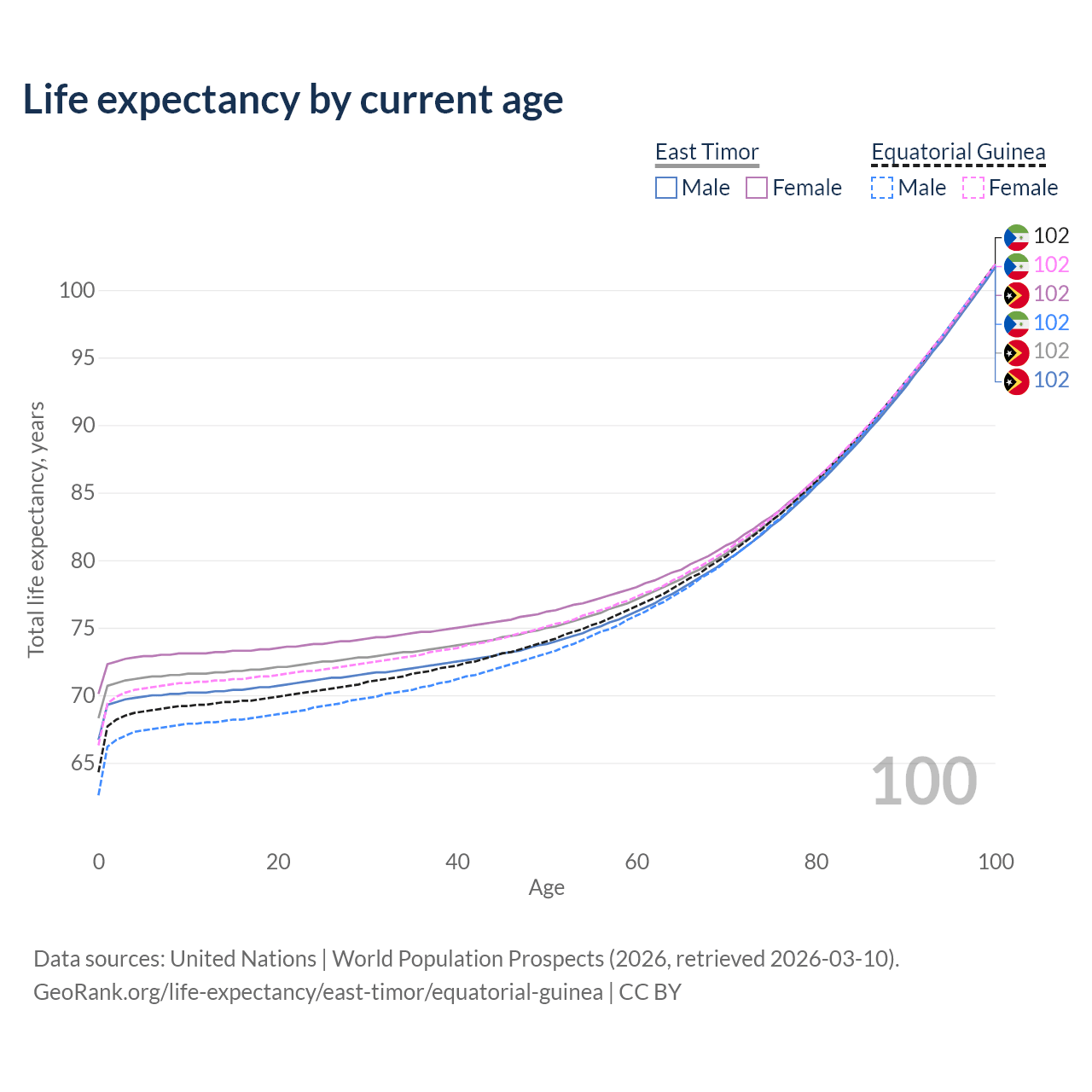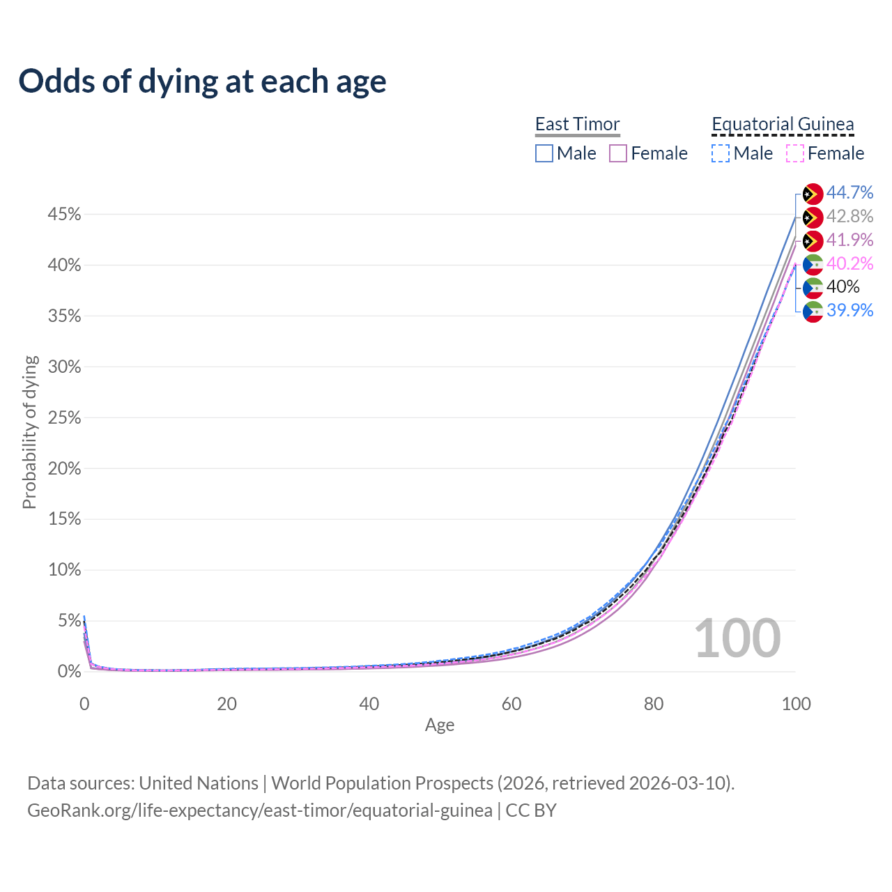 This life expectancy calculator shows the odds of living to 100, 95, 90, and below based on current age for both males and females in East Timor and Equatorial Guinea, along with mean and median age of death. The calculations are based on the 2026 life tables (actuarial tables) from the UN World Population Prospects.