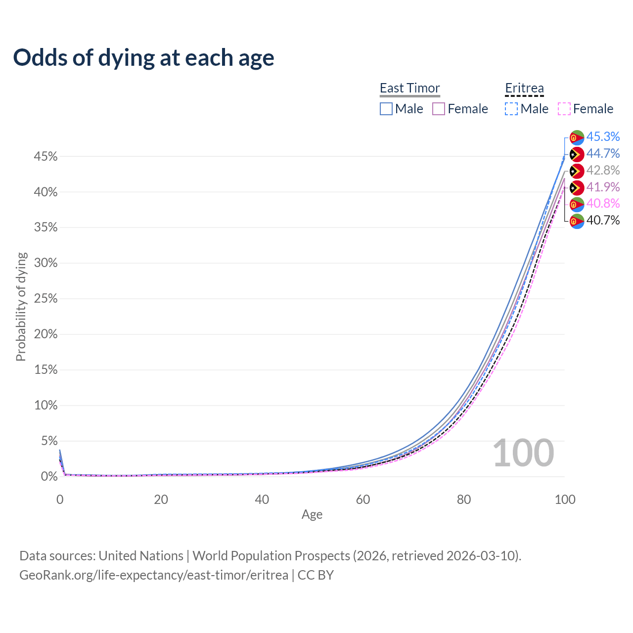This life expectancy calculator shows the odds of living to 100, 95, 90, and below based on current age for both males and females in East Timor and Eritrea, along with mean and median age of death. The calculations are based on the 2026 life tables (actuarial tables) from the UN World Population Prospects.