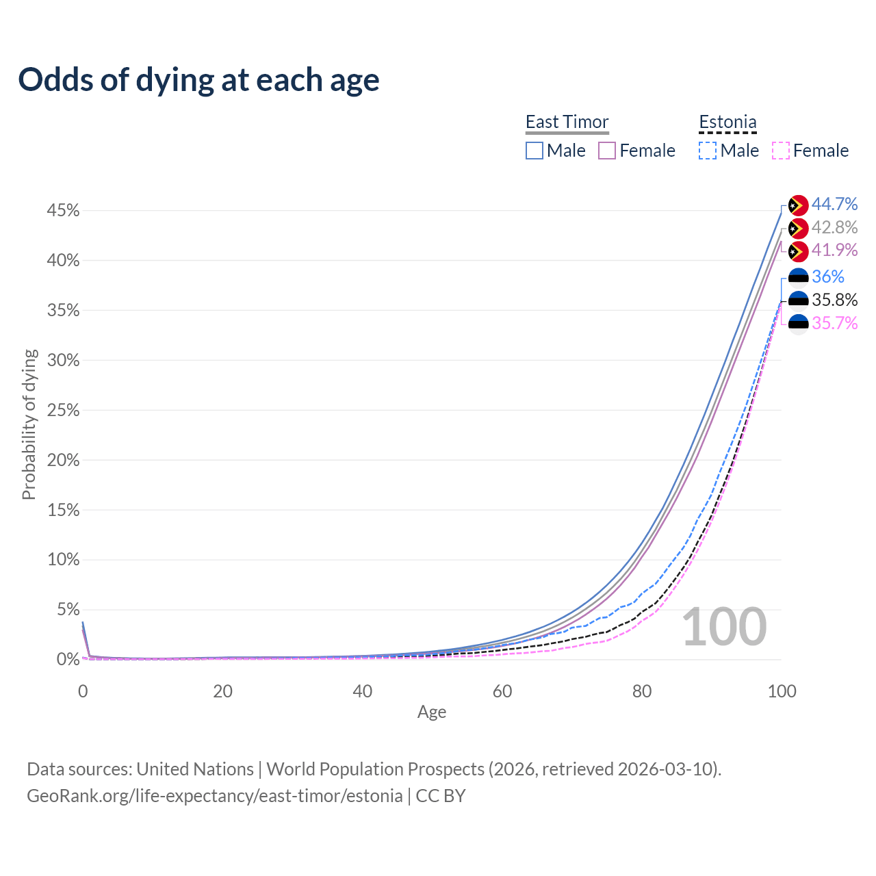 This life expectancy calculator shows the odds of living to 100, 95, 90, and below based on current age for both males and females in East Timor and Estonia, along with mean and median age of death. The calculations are based on the 2026 life tables (actuarial tables) from the UN World Population Prospects.