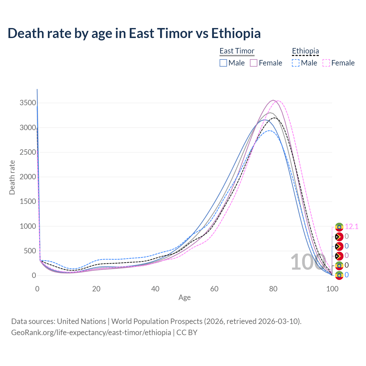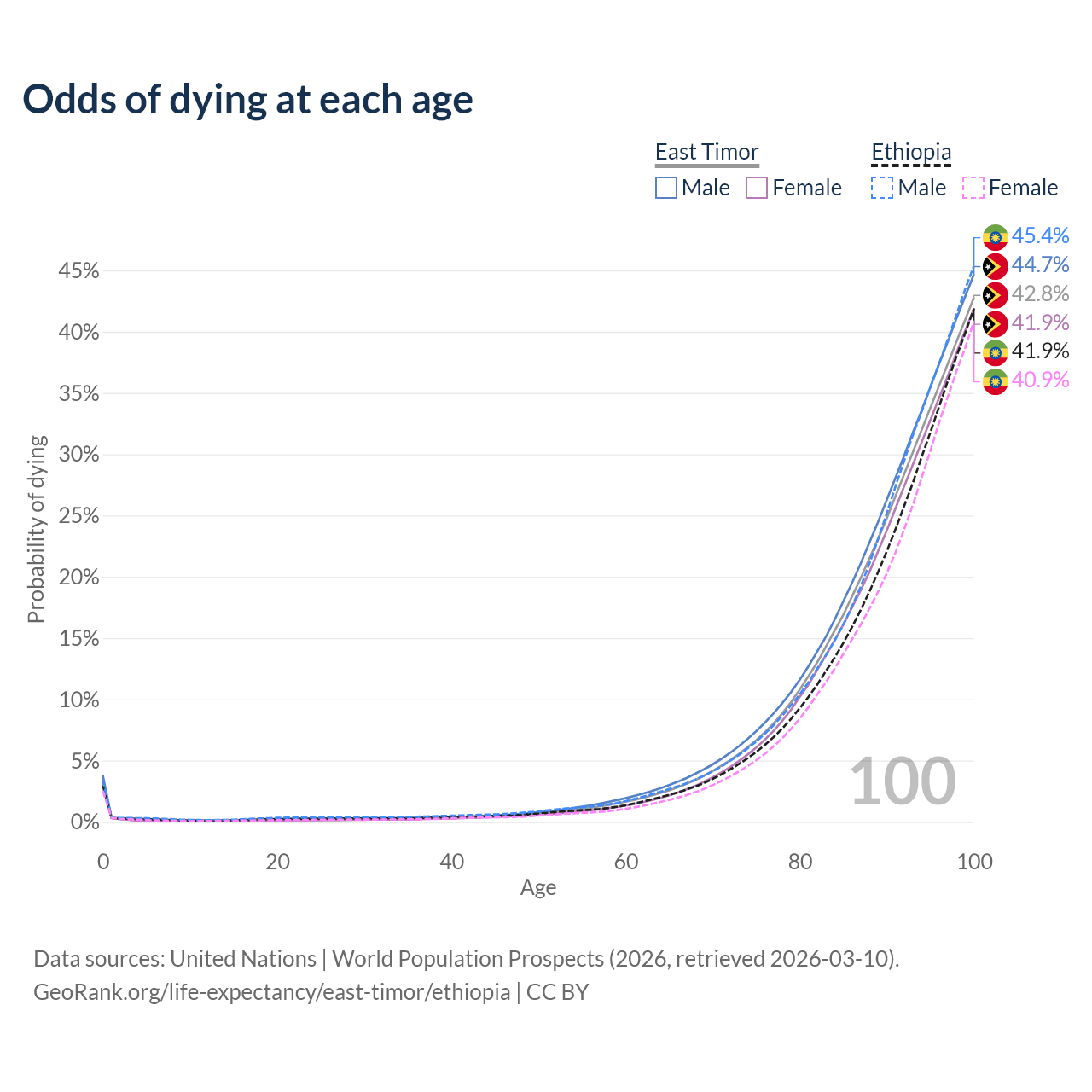 This life expectancy calculator shows the odds of living to 100, 95, 90, and below based on current age for both males and females in East Timor and Ethiopia, along with mean and median age of death. The calculations are based on the 2026 life tables (actuarial tables) from the UN World Population Prospects.