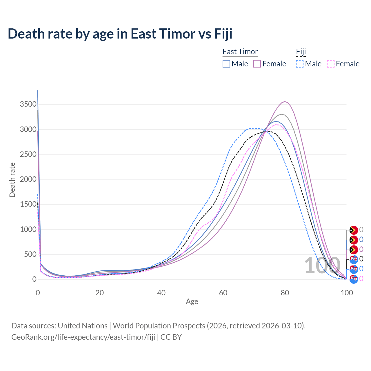 In East Timor, the most common age of death is 0, compared to 74 in Fiji. The median age of death is 73.9 in East Timor and 70.5 in Fiji, meaning only half of each cohort is expected to live past that age.