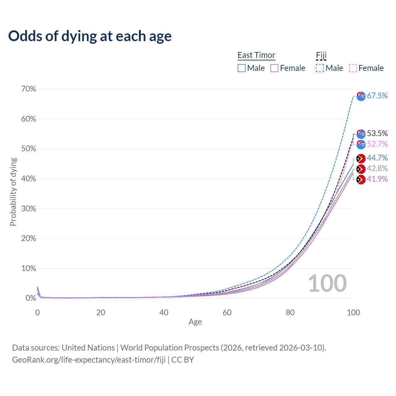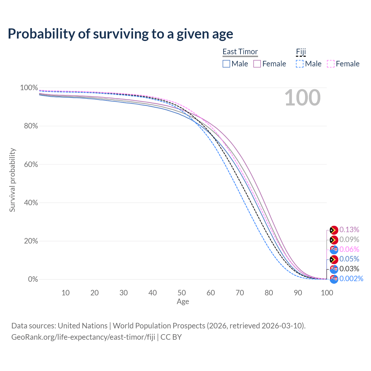 This life expectancy calculator shows the odds of living to 100, 95, 90, and below based on current age for both males and females in East Timor and Fiji, along with mean and median age of death. The calculations are based on the 2026 life tables (actuarial tables) from the UN World Population Prospects.