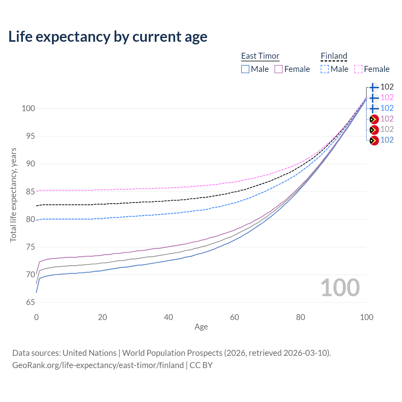 This life expectancy calculator shows the odds of living to 100, 95, 90, and below based on current age for both males and females in East Timor and Finland, along with mean and median age of death. The calculations are based on the 2026 life tables (actuarial tables) from the UN World Population Prospects.
