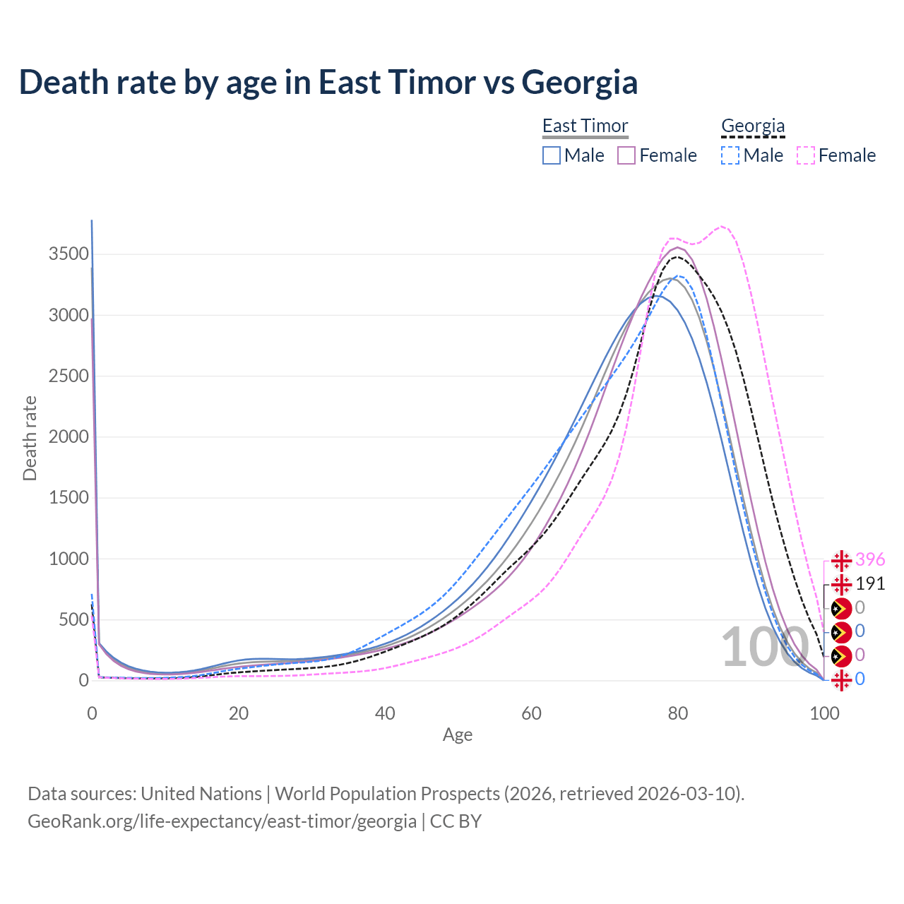 In East Timor, the most common age of death is 0, compared to 80 in Georgia. The median age of death is 73.9 in East Timor and 78.2 in Georgia, meaning only half of each cohort is expected to live past that age.