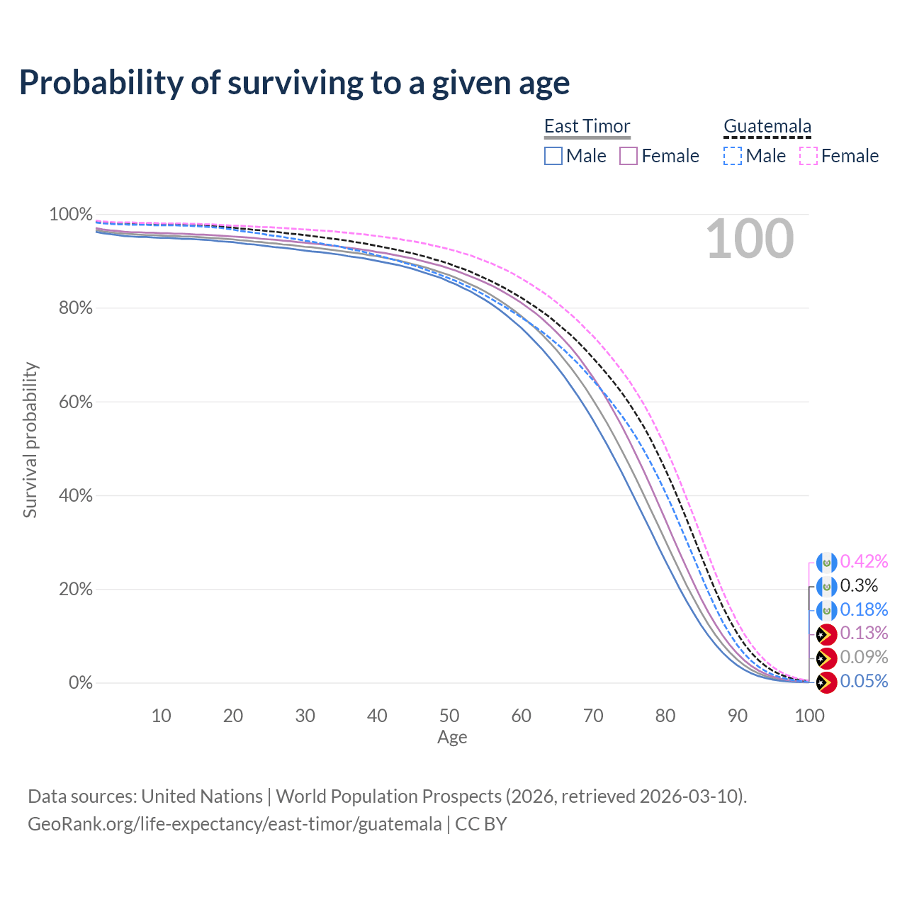 This life expectancy calculator shows the odds of living to 100, 95, 90, and below based on current age for both males and females in East Timor and Guatemala, along with mean and median age of death. The calculations are based on the 2026 life tables (actuarial tables) from the UN World Population Prospects.