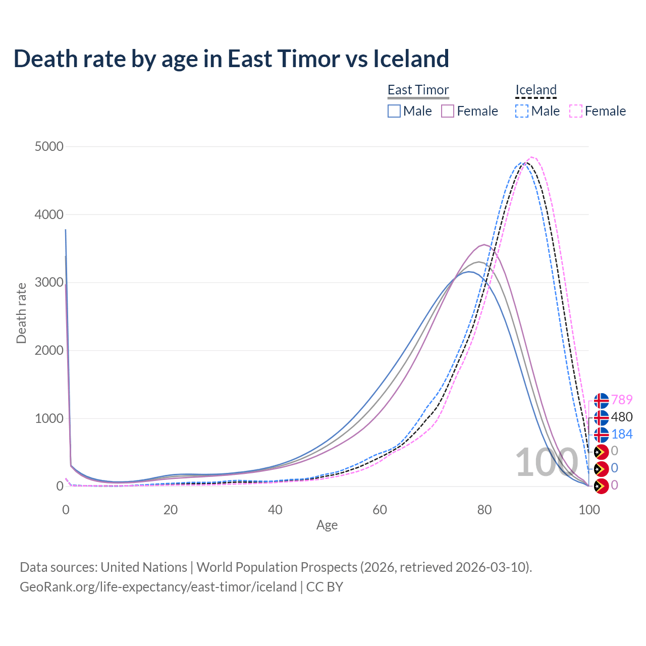 In East Timor, the most common age of death is 0, compared to 88 in Iceland. The median age of death is 73.9 in East Timor and 85.9 in Iceland, meaning only half of each cohort is expected to live past that age.
