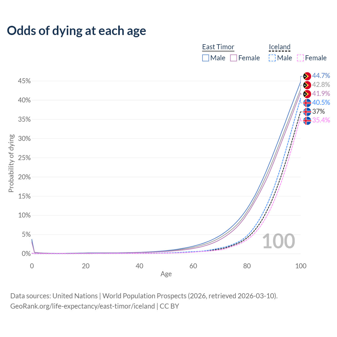 This life expectancy calculator shows the odds of living to 100, 95, 90, and below based on current age for both males and females in East Timor and Iceland, along with mean and median age of death. The calculations are based on the 2026 life tables (actuarial tables) from the UN World Population Prospects.