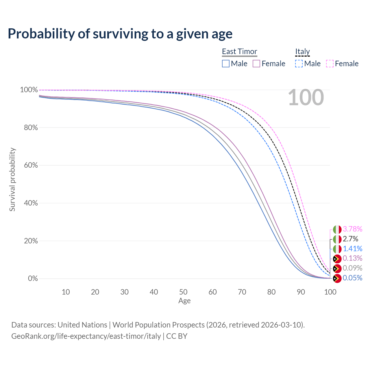 This life expectancy calculator shows the odds of living to 100, 95, 90, and below based on current age for both males and females in East Timor and Italy, along with mean and median age of death. The calculations are based on the 2026 life tables (actuarial tables) from the UN World Population Prospects.