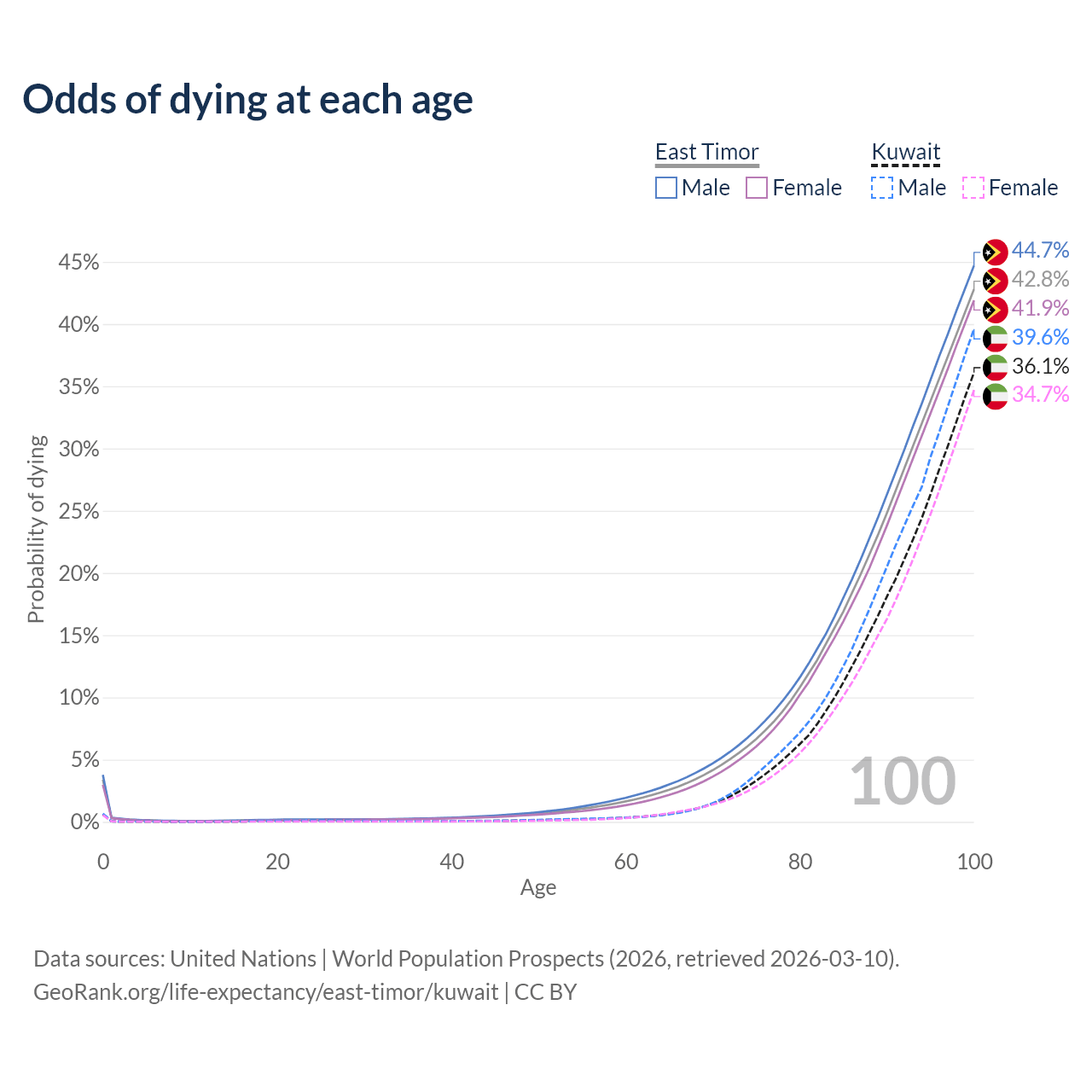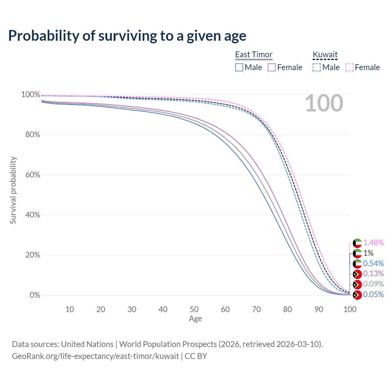 This life expectancy calculator shows the odds of living to 100, 95, 90, and below based on current age for both males and females in East Timor and Kuwait, along with mean and median age of death. The calculations are based on the 2026 life tables (actuarial tables) from the UN World Population Prospects.