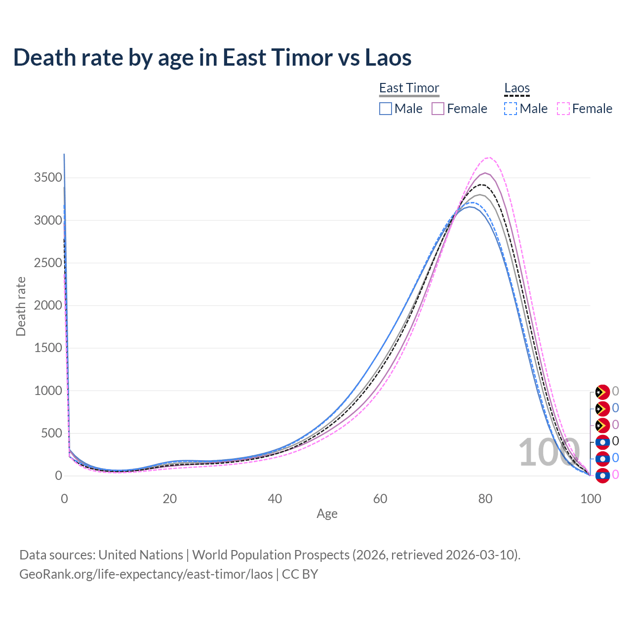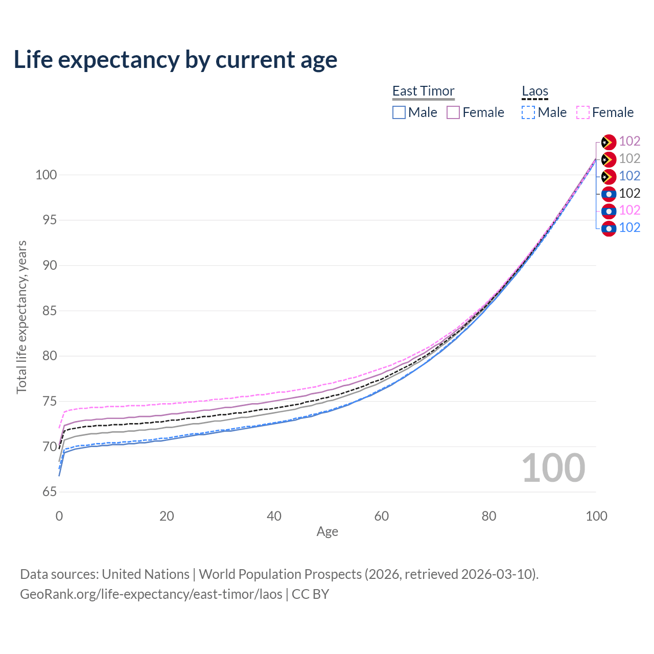 This life expectancy calculator shows the odds of living to 100, 95, 90, and below based on current age for both males and females in East Timor and Laos, along with mean and median age of death. The calculations are based on the 2026 life tables (actuarial tables) from the UN World Population Prospects.