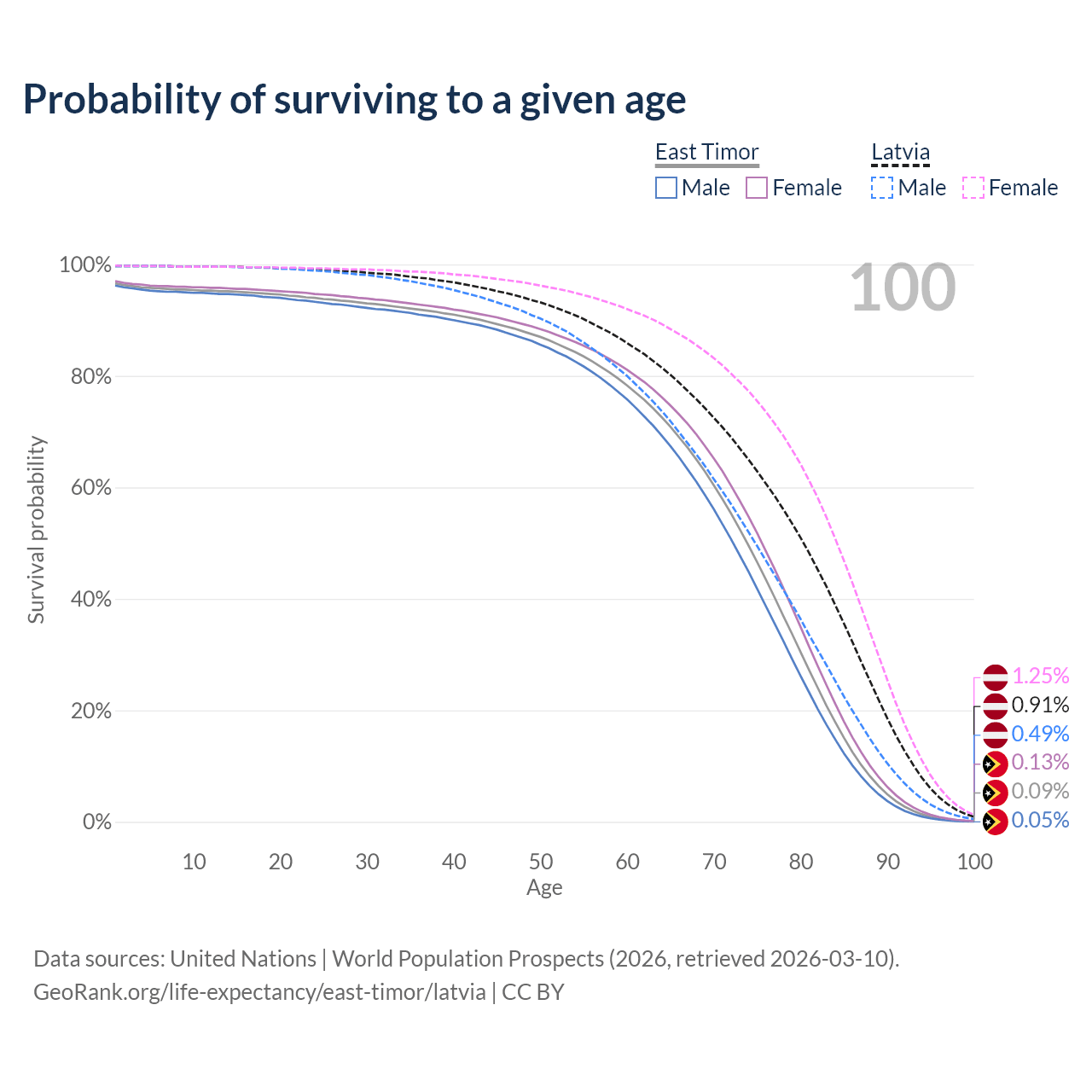 This life expectancy calculator shows the odds of living to 100, 95, 90, and below based on current age for both males and females in East Timor and Latvia, along with mean and median age of death. The calculations are based on the 2026 life tables (actuarial tables) from the UN World Population Prospects.