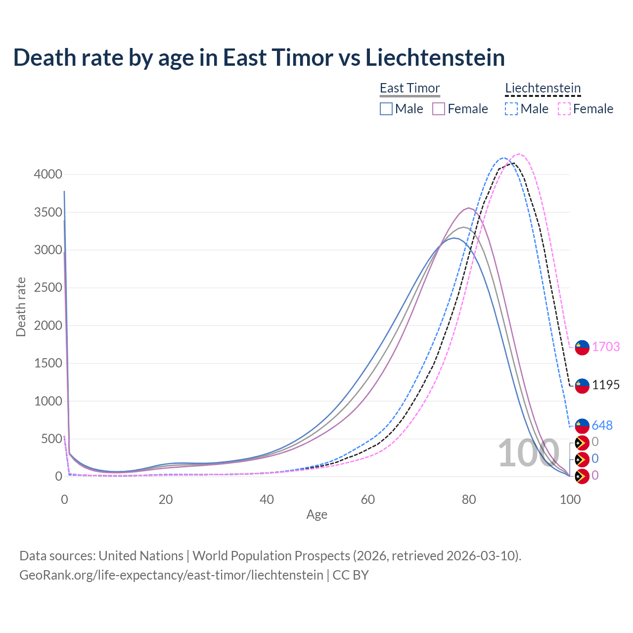 In East Timor, the most common age of death is 0, compared to 89 in Liechtenstein. The median age of death is 73.9 in East Timor and 86.3 in Liechtenstein, meaning only half of each cohort is expected to live past that age.