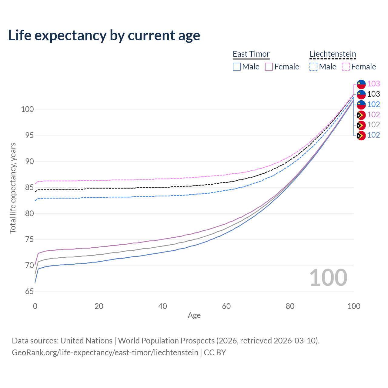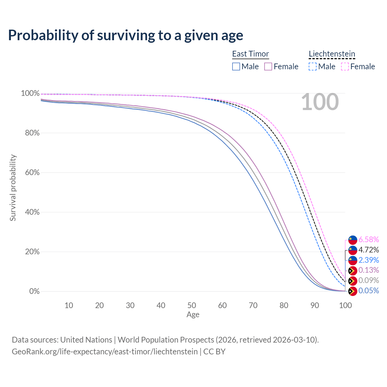 This life expectancy calculator shows the odds of living to 100, 95, 90, and below based on current age for both males and females in East Timor and Liechtenstein, along with mean and median age of death. The calculations are based on the 2026 life tables (actuarial tables) from the UN World Population Prospects.