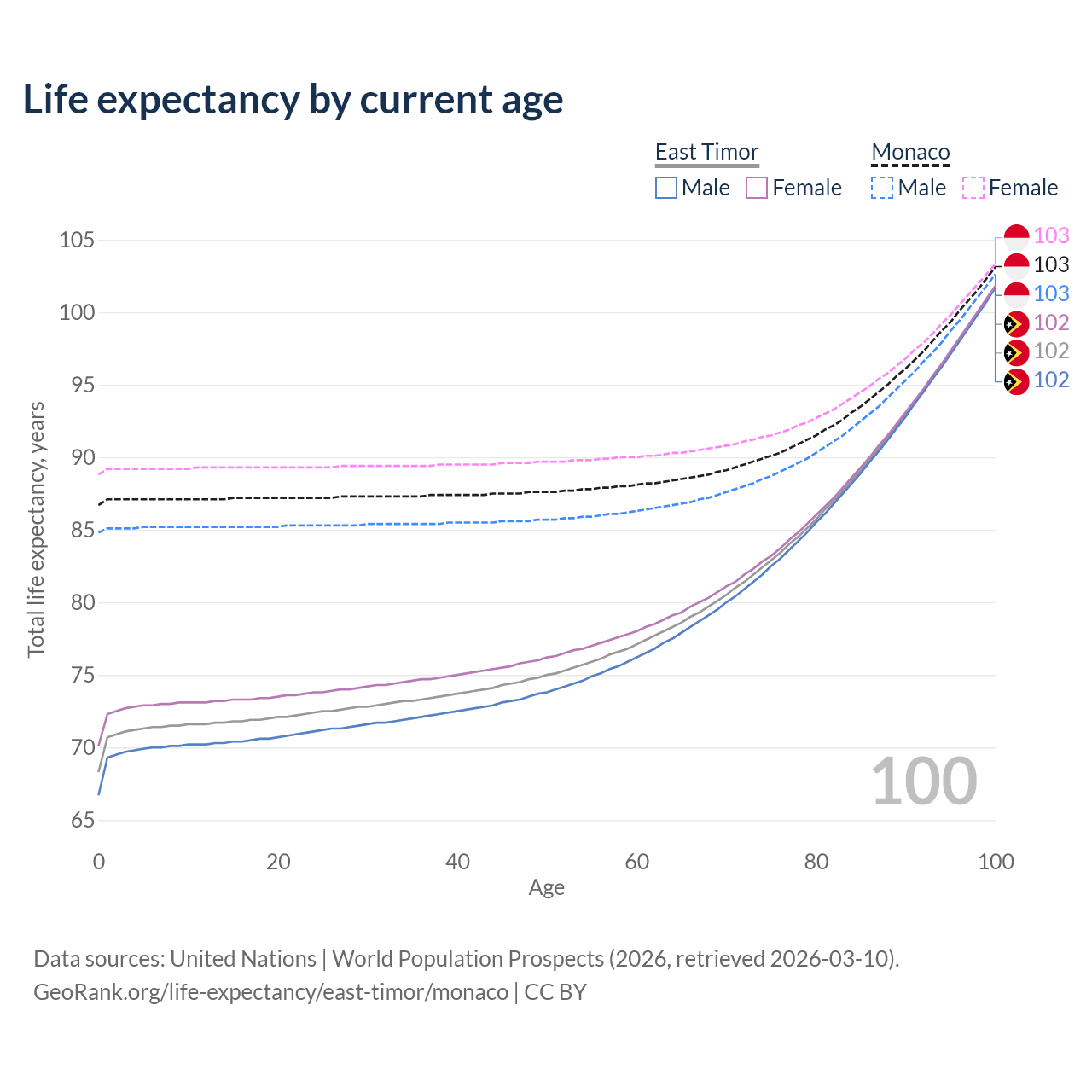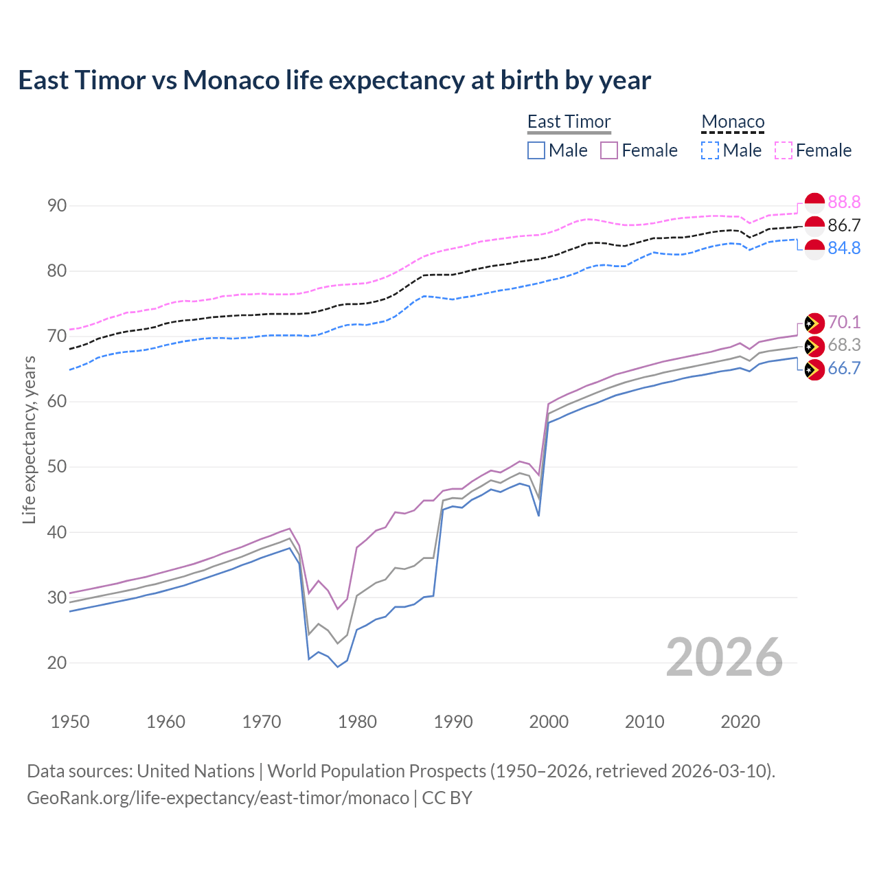 The average life expectancy at birth is 68.3 years in East Timor vs 86.7 in Monaco. East Timor is ranked 149/197 by life expectancy, and Monaco is 1/197. In East Timor, the life expectancy is 66.7 years for males and 70.1 years for females. In Monaco, it's 84.8 years for males and 88.8 years for females.