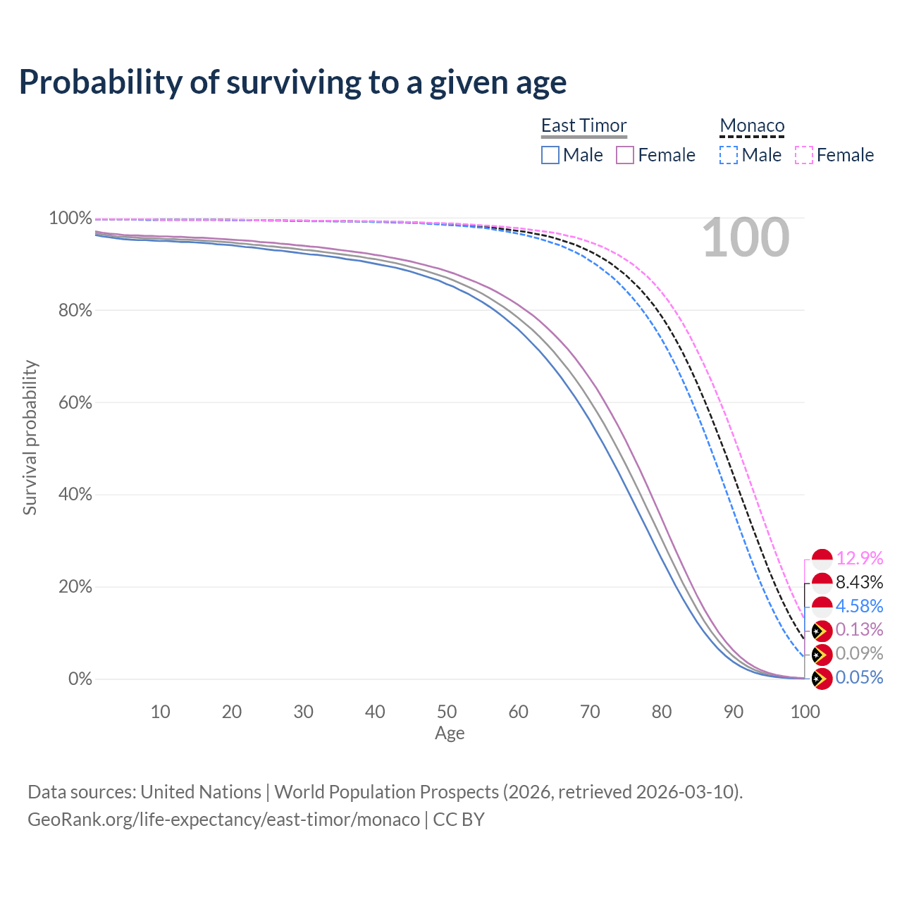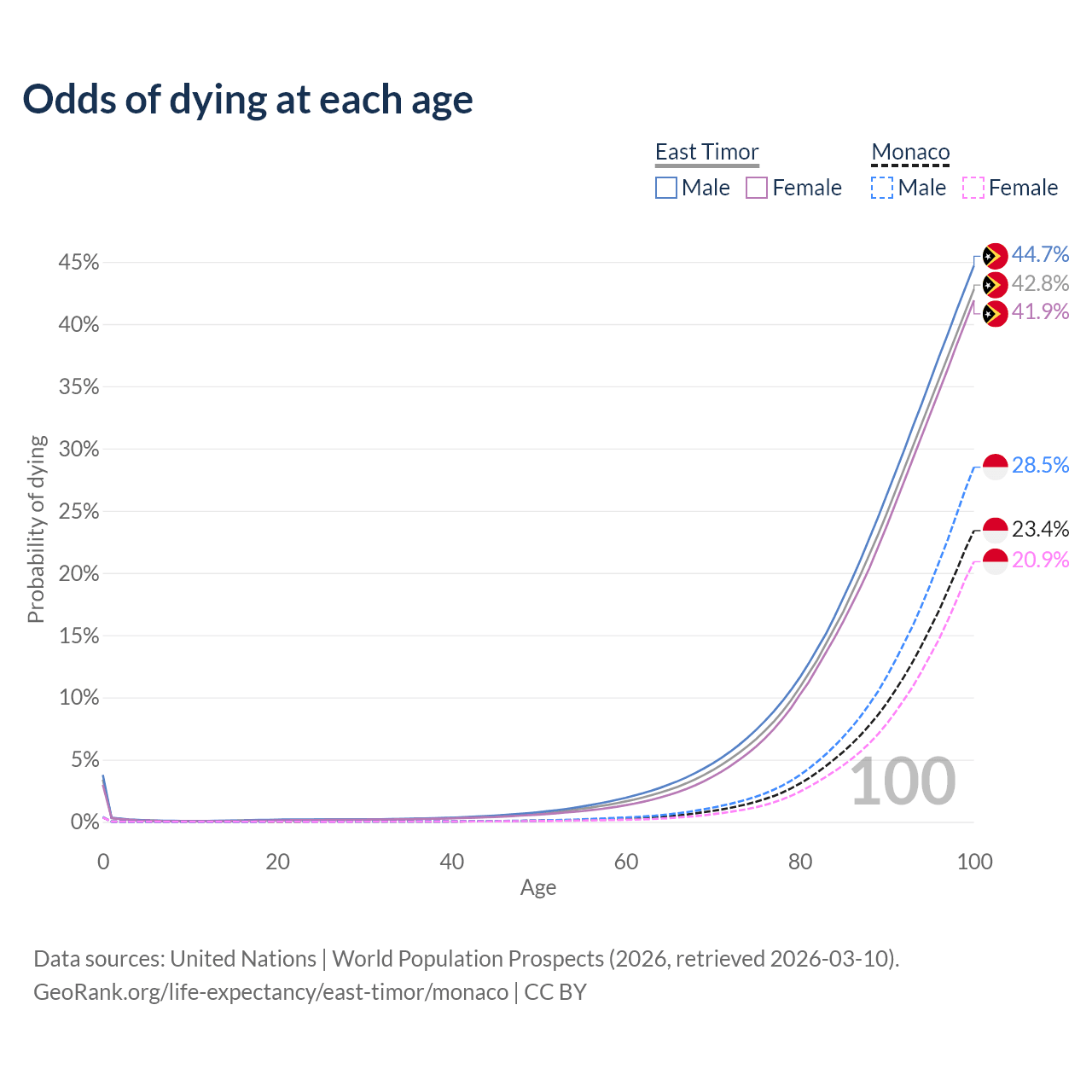 This life expectancy calculator shows the odds of living to 100, 95, 90, and below based on current age for both males and females in East Timor and Monaco, along with mean and median age of death. The calculations are based on the 2026 life tables (actuarial tables) from the UN World Population Prospects.