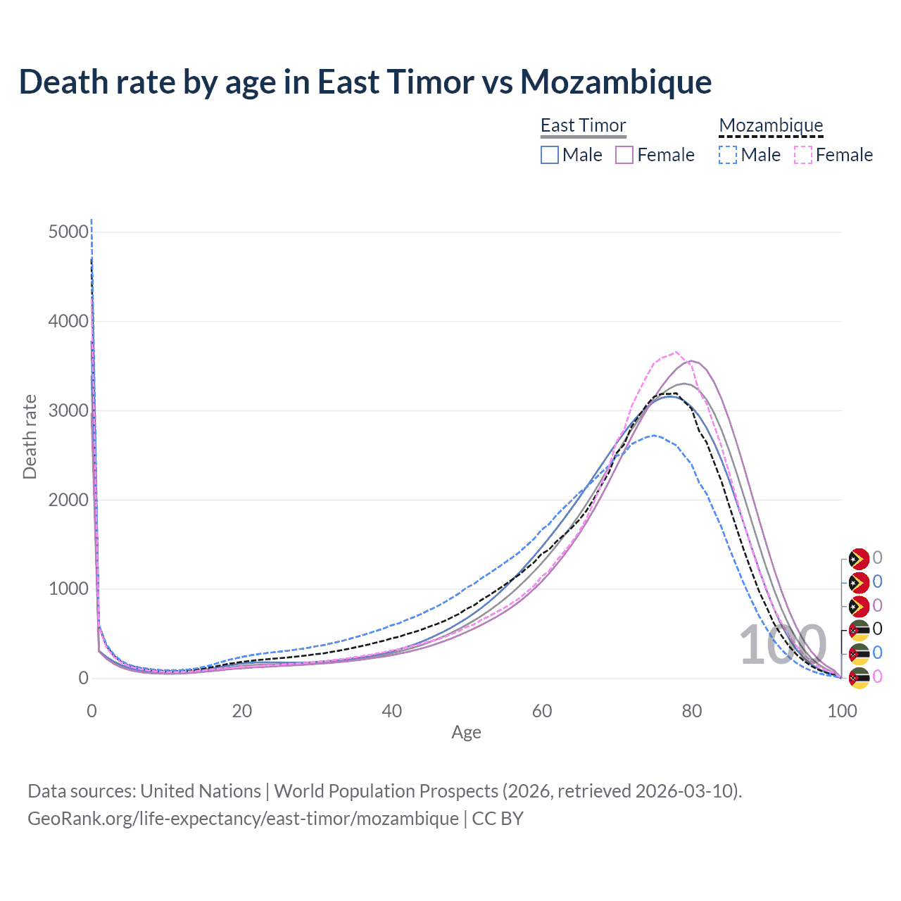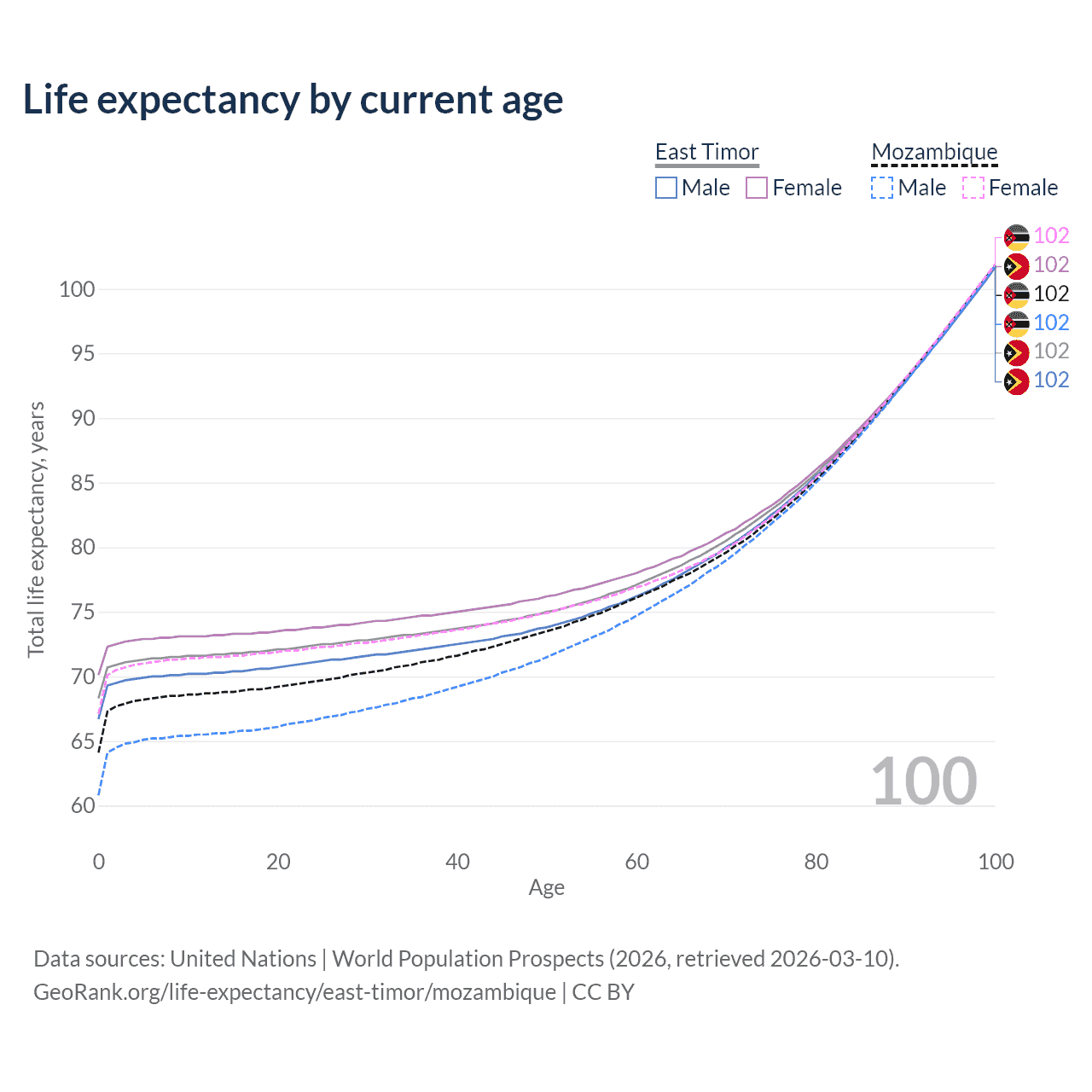 This life expectancy calculator shows the odds of living to 100, 95, 90, and below based on current age for both males and females in East Timor and Mozambique, along with mean and median age of death. The calculations are based on the 2026 life tables (actuarial tables) from the UN World Population Prospects.
