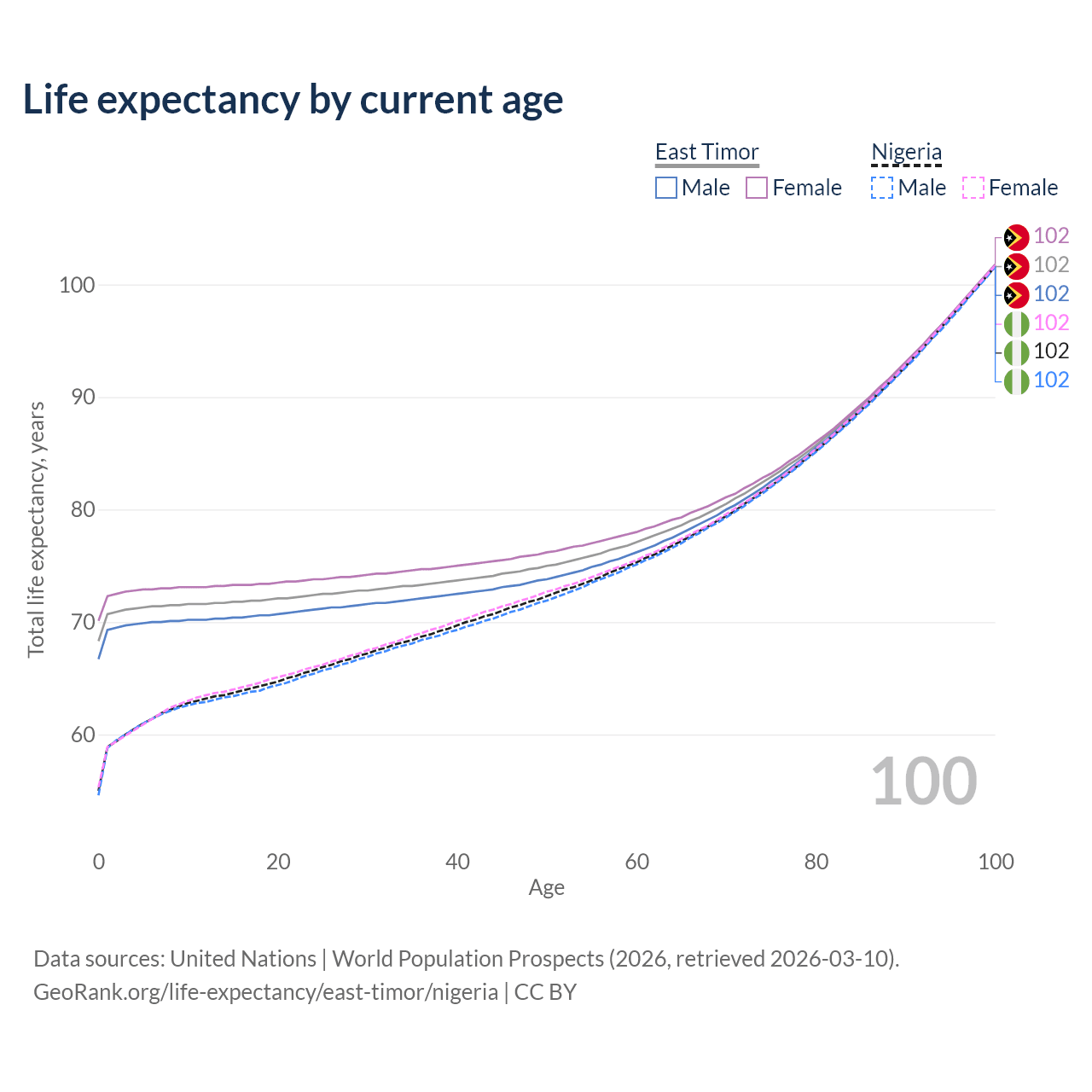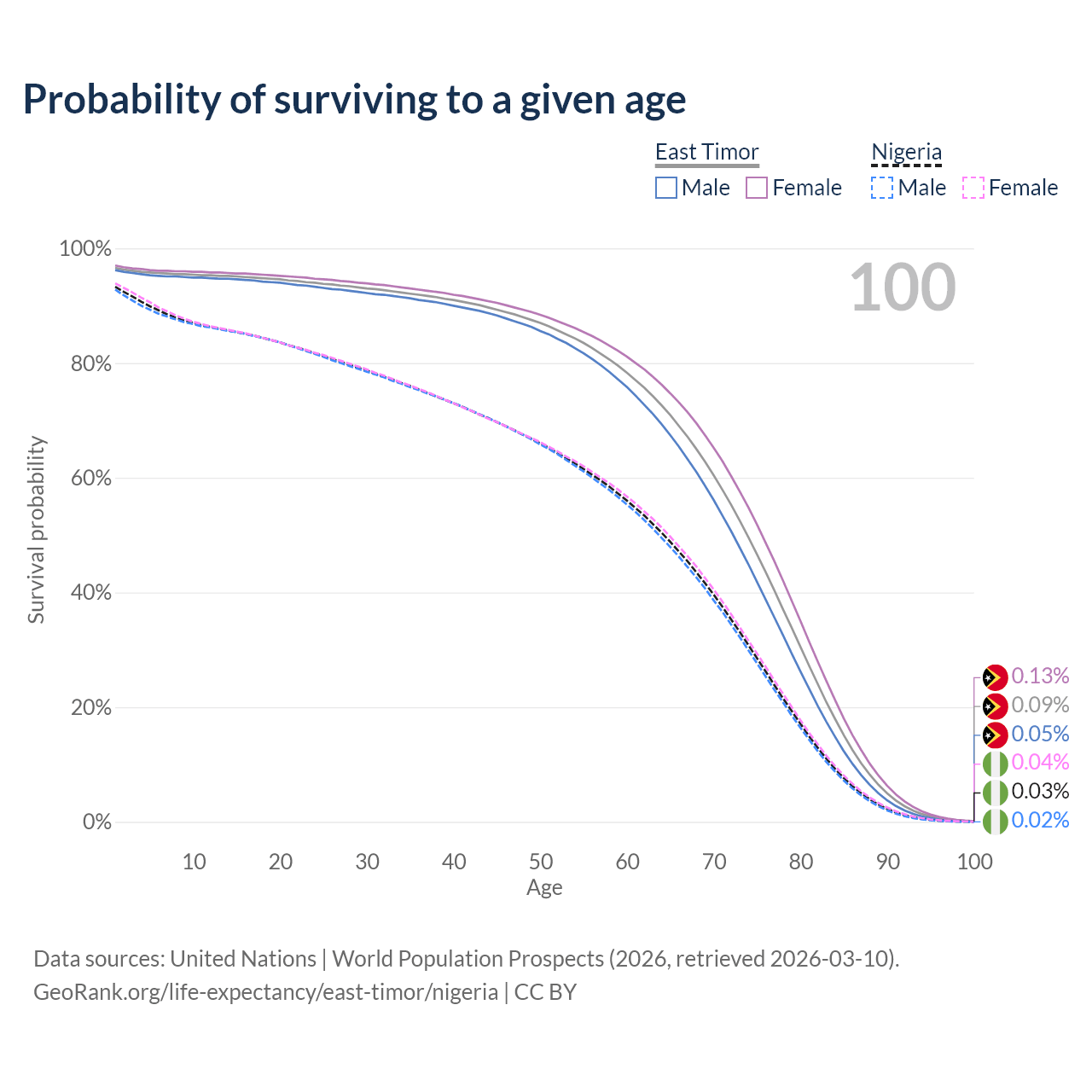 This life expectancy calculator shows the odds of living to 100, 95, 90, and below based on current age for both males and females in East Timor and Nigeria, along with mean and median age of death. The calculations are based on the 2026 life tables (actuarial tables) from the UN World Population Prospects.