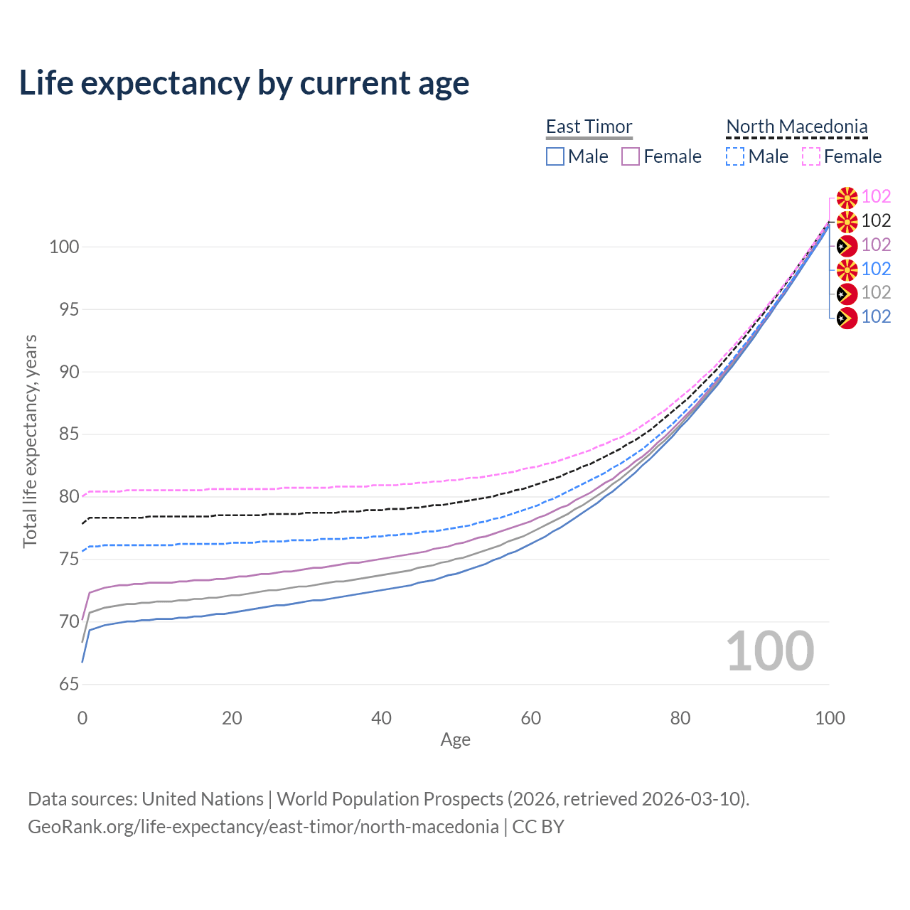 This life expectancy calculator shows the odds of living to 100, 95, 90, and below based on current age for both males and females in East Timor and North Macedonia, along with mean and median age of death. The calculations are based on the 2026 life tables (actuarial tables) from the UN World Population Prospects.