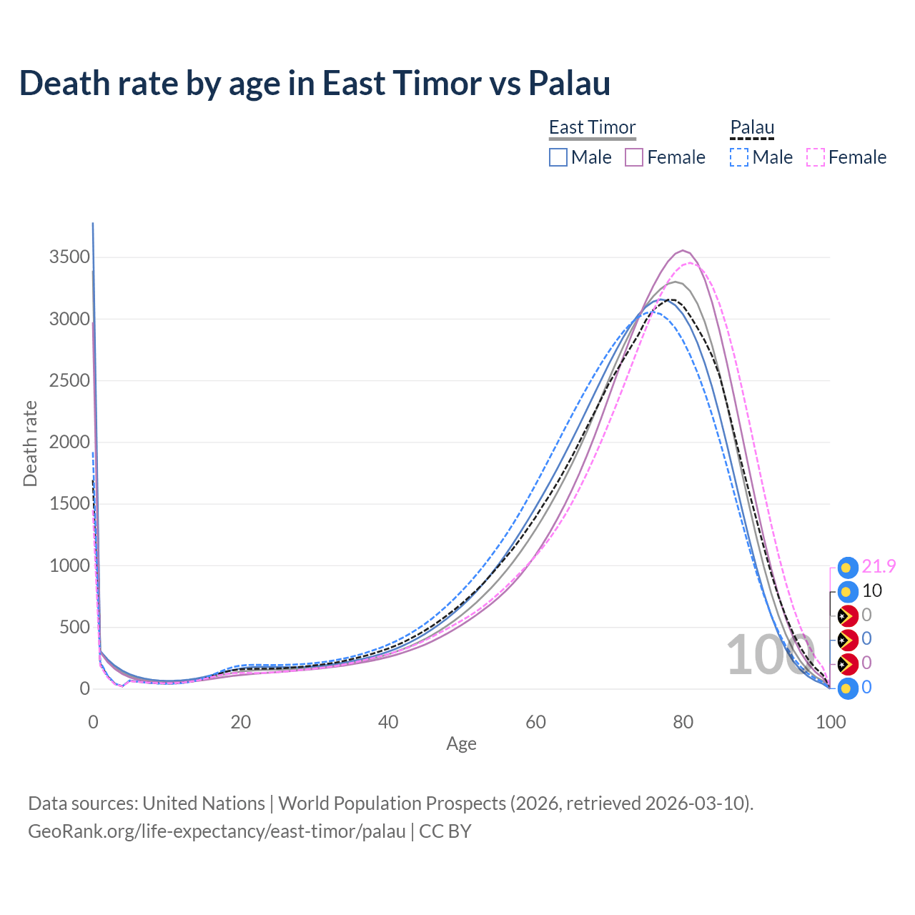 In East Timor, the most common age of death is 0, compared to 78 in Palau. The median age of death is 73.9 in East Timor and 73.8 in Palau, meaning only half of each cohort is expected to live past that age.