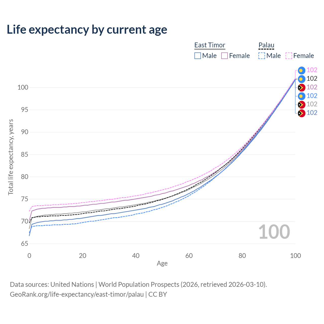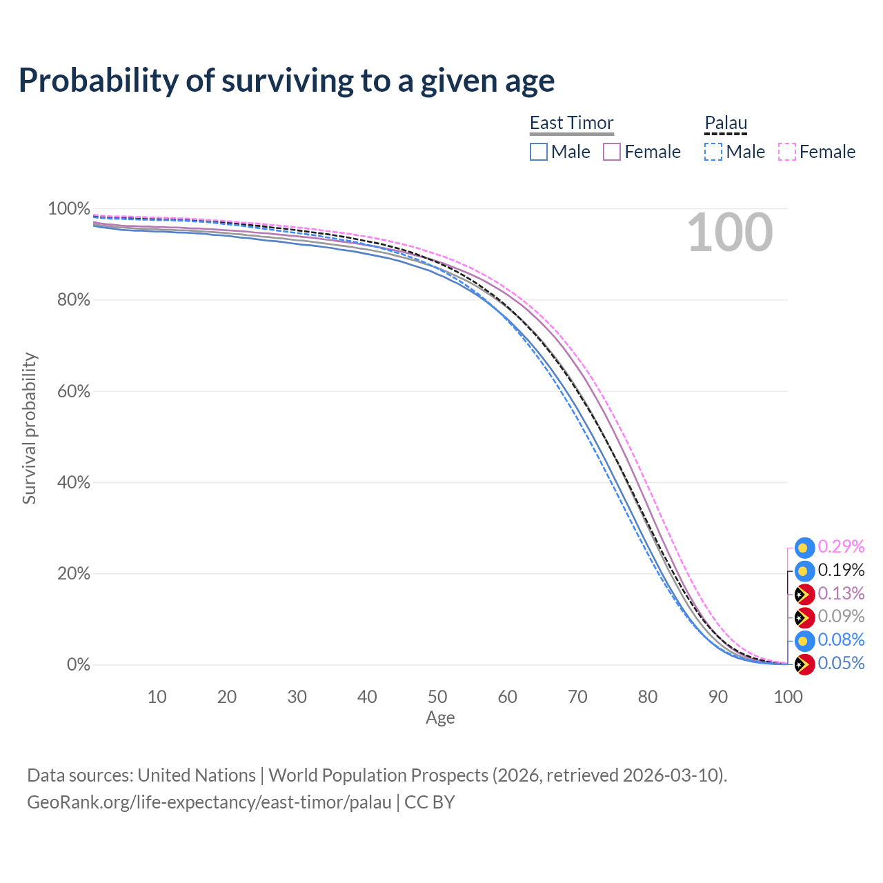 This life expectancy calculator shows the odds of living to 100, 95, 90, and below based on current age for both males and females in East Timor and Palau, along with mean and median age of death. The calculations are based on the 2026 life tables (actuarial tables) from the UN World Population Prospects.