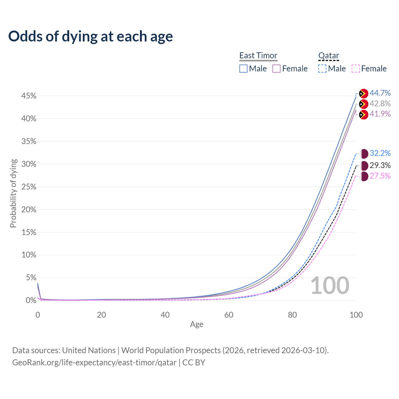 This life expectancy calculator shows the odds of living to 100, 95, 90, and below based on current age for both males and females in East Timor and Qatar, along with mean and median age of death. The calculations are based on the 2026 life tables (actuarial tables) from the UN World Population Prospects.