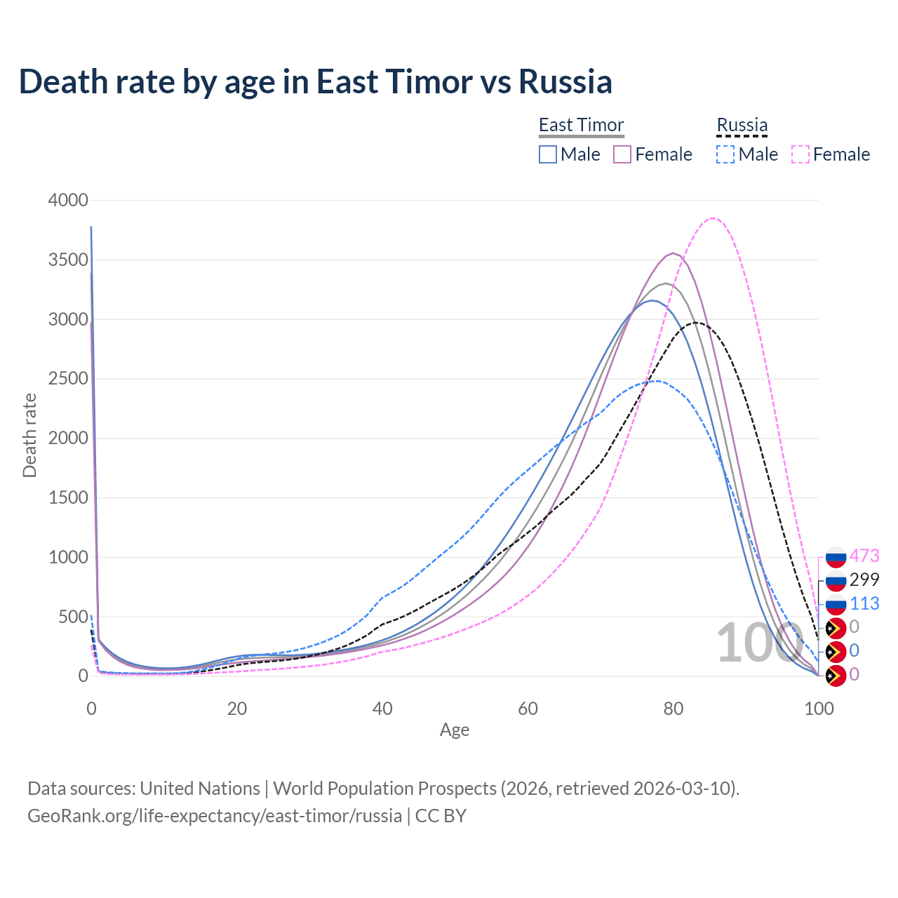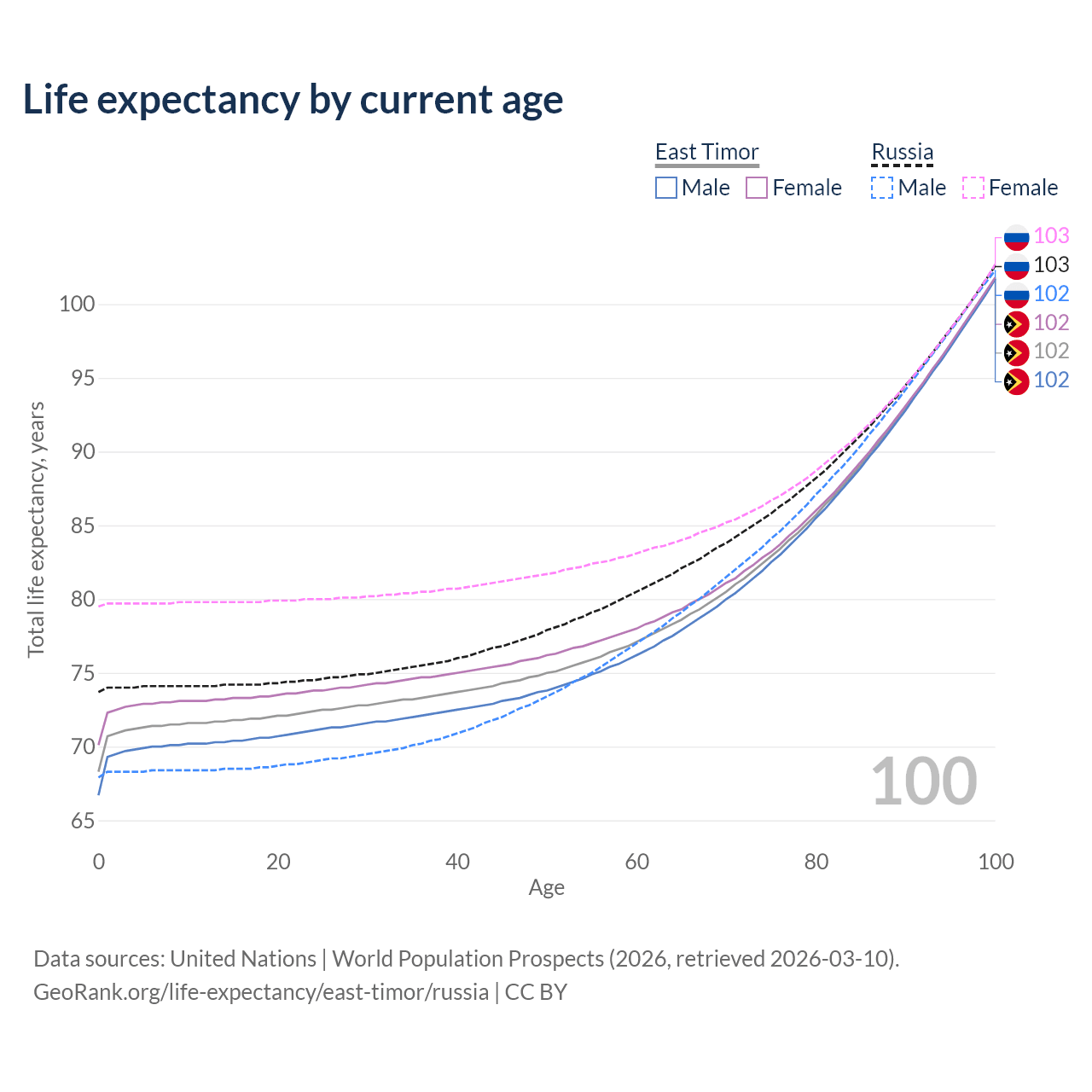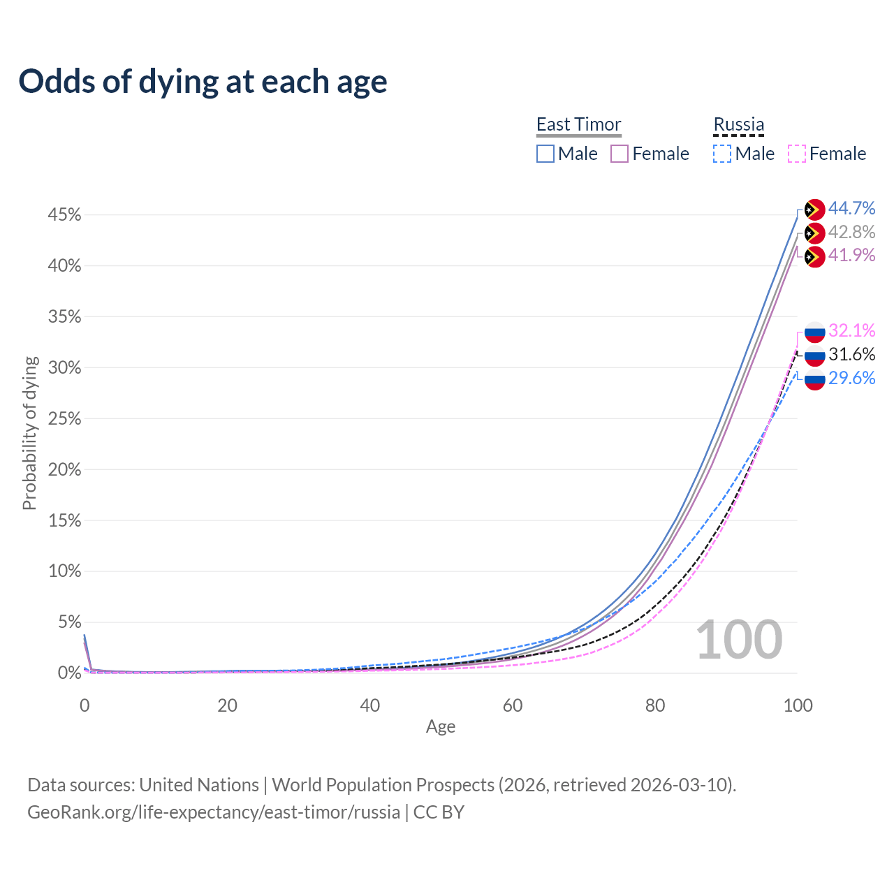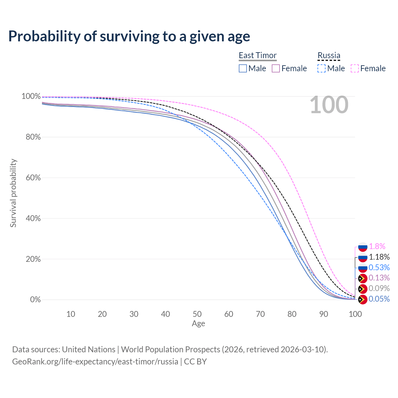 This life expectancy calculator shows the odds of living to 100, 95, 90, and below based on current age for both males and females in East Timor and Russia, along with mean and median age of death. The calculations are based on the 2026 life tables (actuarial tables) from the UN World Population Prospects.