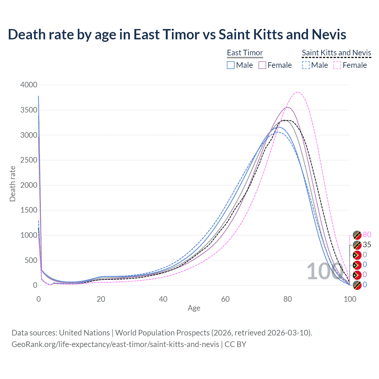 In East Timor, the most common age of death is 0, compared to 80 in Saint Kitts and Nevis. The median age of death is 73.9 in East Timor and 76.3 in Saint Kitts and Nevis, meaning only half of each cohort is expected to live past that age.